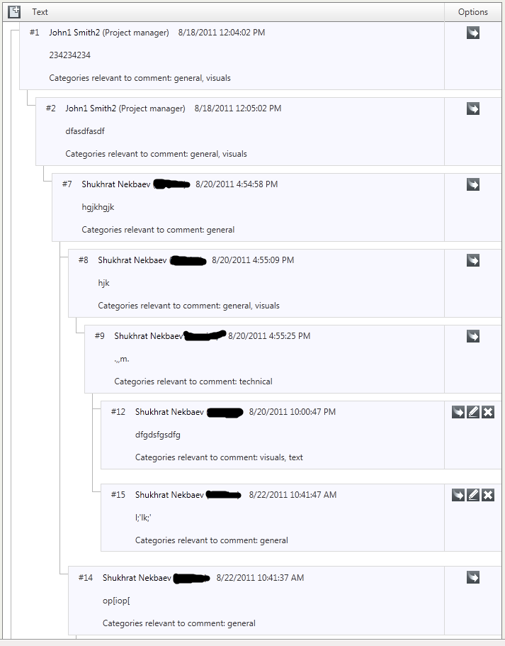 <telerik:RadTreeList ID="radListComments" runat="server" DataKeyNames="group_discussion_id" ParentDataKeyNames="group_discussion_parent_id" AllowRecursiveDelete="True" AutoGenerateColumns="False" OnItemCreated="radListComments_ItemCreated" OnUpdateCommand="radListComments_UpdateCommand" OnInsertCommand="radListComments_InsertCommand" OnDeleteCommand="radListComments_DeleteCommand" OnItemDataBound="radListComments_ItemDataBound" OnNeedDataSource="radListComments_NeedDataSource" BorderStyle="None"> <ClientSettings> <Selecting AllowItemSelection="True" /> <ClientEvents OnTreeListCreated="createPrettyCommentsView"/> </ClientSettings> <EditFormSettings EditFormType="Template" > <FormTemplate> </FormTemplate> </EditFormSettings> <Columns> <telerik:TreeListTemplateColumn HeaderStyle-Width="80%" HeaderStyle-BackColor="White" HeaderStyle-BorderStyle="None" ItemStyle-BorderStyle="NotSet"> <HeaderTemplate> <asp:Literal ID="ltrCol1" runat="server" ></asp:Literal> <asp:LinkButton ID="NewButton" ToolTip="New Discussion" ForeColor="Green" runat="server" CommandName="InitInsert" Text="New Discussion" Font-Size="Large" Height="28px" BorderStyle="None" ></asp:LinkButton> </HeaderTemplate> <ItemTemplate> <div> Subject: <%# Eval("discussion_subject")%><br /><br /> Post: <%# Eval("discussion_post")%><br /> Name: <%# Eval("posted_by_name")%><br /> Date created: <%# Eval("created_date") %> </div> </ItemTemplate> </telerik:TreeListTemplateColumn> <telerik:TreeListTemplateColumn HeaderStyle-BackColor="White" HeaderStyle-BorderStyle="None" ItemStyle-BorderStyle="NotSet" HeaderStyle-Width="20%"> <HeaderTemplate><asp:Literal ID="ltrCol2" runat="server" /></HeaderTemplate> <ItemTemplate> <asp:LinkButton ID="ReplyButton" ToolTip="Reply" ForeColor="Green" runat="server" Font-Size="Medium" CommandName="InitInsert" CommandArgument='<%# Eval("group_discussion_id") %>' Text="Reply"> </asp:LinkButton> <asp:LinkButton ID="EditButton" ToolTip="Edit" ForeColor="Green" runat="server" Font-Size="Medium" CommandName="Edit" Text="Edit"> </asp:LinkButton> <asp:LinkButton ID="DeleteButton" ToolTip="Delete" ForeColor="Green" runat="server" Font-Size="Medium" CommandName="Delete" Text="Delete"> </asp:LinkButton> </ItemTemplate> </telerik:TreeListTemplateColumn> </Columns> <EditFormSettings EditFormType="Template"> <FormTemplate> </FormTemplate> </EditFormSettings> </telerik:RadTreeList>Please note that you have selection enabled for items, when clicked on some item it gets selected and you don't see underlying text. No, it's not gone, it's just css issue, you may want to fix that also :) Another thing I did is that I've removed div's height to 20px, no need to limit like that, let the content "say" how big it should be.