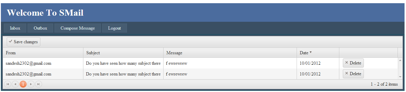 $(document).ready(function () { var keyvalue = window.document.URL.toString().split('?')[1]; var dataSource = new kendo.data.DataSource({ transport: { read: { url: "http://localhost:51565/GetMail.ashx?" + keyvalue + "&action=select", dataType: "json" }, destroy: { url: "http://localhost:51565/GetMail.ashx?" + keyvalue + "&action=destroy", dataType: "json", complete: function (jqXHR, textStatus) { ds.read(); } }, update: { url: "http://localhost:51565/GetMail.ashx?" + keyvalue + "&action=update", dataType: "json" }, parameterMap: function (options, operation) { if (operation !== "read" && options.models) { return { models: kendo.stringify(options.models) }; } } }, batch: true, pageSize: 10, schema: { model: { id: "id", fields: { from: { type: "string" }, subject: { type: "string" }, body: { type: "string" }, time: { type: "date" } } } } }); $("#grid").kendoGrid({ dataSource: dataSource, sortable: true, pageable: true, editable: true, toolbar: ["save"], columns: [ { field: "from", title: "From", width: 150 }, { field: "subject", title: "Subject", width: 150 }, { field: "body", title: "Message", width: 250 }, { field: "time", title: "Date", width: 80, template: '#= kendo.toString(time,"MM/dd/yyyy") #' }, { command: "destroy", title: " ", width: 110}] });});