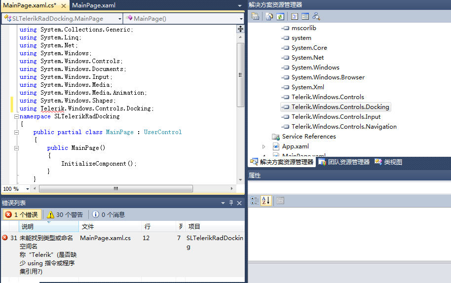 错误 31 未能找到类型或命名空间名称“Telerik”(是否缺少 using 指令或程序集引用?) C:\Users\Administrator\Desktop\Test\SLTelerikRadDocking\SLTelerikRadDocking\MainPage.xaml.cs 12 7 SLTelerikRadDocking