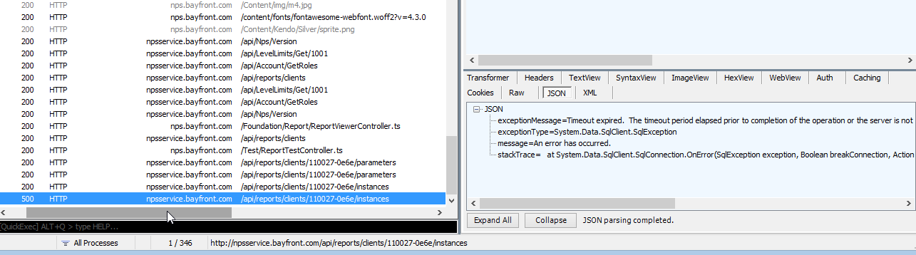 stackTrace= at System.Data.SqlClient.SqlConnection.OnError(SqlException exception, Boolean breakConnection, Action`1 wrapCloseInAction) at System.Data.SqlClient.TdsParser.ThrowExceptionAndWarning(TdsParserStateObject stateObj, Boolean callerHasConnectionLock, Boolean asyncClose) at System.Data.SqlClient.TdsParser.TryRun(RunBehavior runBehavior, SqlCommand cmdHandler, SqlDataReader dataStream, BulkCopySimpleResultSet bulkCopyHandler, TdsParserStateObject stateObj, Boolean& dataReady) at System.Data.SqlClient.SqlCommand.FinishExecuteReader(SqlDataReader ds, RunBehavior runBehavior, String resetOptionsString) at System.Data.SqlClient.SqlCommand.RunExecuteReaderTds(CommandBehavior cmdBehavior, RunBehavior runBehavior, Boolean returnStream, Boolean async, Int32 timeout, Task& task, Boolean asyncWrite, SqlDataReader ds) at System.Data.SqlClient.SqlCommand.RunExecuteReader(CommandBehavior cmdBehavior, RunBehavior runBehavior, Boolean returnStream, String method, TaskCompletionSource`1 completion, Int32 timeout, Task& task, Boolean asyncWrite) at System.Data.SqlClient.SqlCommand.InternalExecuteNonQuery(TaskCompletionSource`1 completion, String methodName, Boolean sendToPipe, Int32 timeout, Boolean asyncWrite) at System.Data.SqlClient.SqlCommand.ExecuteNonQuery() at Telerik.Reporting.Cache.MsSqlServerStorage.AcquireLock(String key) at Telerik.Reporting.Services.Engine.KeyItemPersistableCollection`2.ResolveItem(K referredInstanceKey, Boolean& newItem) at Telerik.Reporting.Services.Engine.ReportEngine.CreateReportInstance(String clientID, String report, Dictionary`2 parameterValues) at Telerik.Reporting.Services.WebApi.ReportsControllerBase.CreateInstance(String clientID, ClientReportSource reportSource) at lambda_method(Closure , Object , Object[] ) at System.Web.Http.Controllers.ReflectedHttpActionDescriptor.ActionExecutor.<>c__DisplayClass10.<GetExecutor>b__9(Object instance, Object[] methodParameters) at System.Web.Http.Controllers.ReflectedHttpActionDescriptor.ExecuteAsync(HttpControllerContext controllerContext, IDictionary`2 arguments, CancellationToken cancellationToken)--- End of stack trace from previous location where exception was thrown --- at System.Runtime.CompilerServices.TaskAwaiter.ThrowForNonSuccess(Task task) at System.Runtime.CompilerServices.TaskAwaiter.HandleNonSuccessAndDebuggerNotification(Task task) at System.Runtime.CompilerServices.TaskAwaiter`1.GetResult() at System.Web.Http.Controllers.ApiControllerActionInvoker.<InvokeActionAsyncCore>d__0.MoveNext()--- End of stack trace from previous location where exception was thrown --- at System.Runtime.CompilerServices.TaskAwaiter.ThrowForNonSuccess(Task task) at System.Runtime.CompilerServices.TaskAwaiter.HandleNonSuccessAndDebuggerNotification(Task task) at System.Runtime.CompilerServices.TaskAwaiter`1.GetResult() at System.Web.Http.Filters.ActionFilterAttribute.<CallOnActionExecutedAsync>d__5.MoveNext()--- End of stack trace from previous location where exception was thrown --- at System.Runtime.ExceptionServices.ExceptionDispatchInfo.Throw() at System.Web.Http.Filters.ActionFilterAttribute.<CallOnActionExecutedAsync>d__5.MoveNext()--- End of stack trace from previous location where exception was thrown --- at System.Runtime.CompilerServices.TaskAwaiter.ThrowForNonSuccess(Task task) at System.Runtime.CompilerServices.TaskAwaiter.HandleNonSuccessAndDebuggerNotification(Task task) at System.Web.Http.Filters.ActionFilterAttribute.<ExecuteActionFilterAsyncCore>d__0.MoveNext()--- End of stack trace from previous location where exception was thrown --- at System.Runtime.CompilerServices.TaskAwaiter.ThrowForNonSuccess(Task task) at System.Runtime.CompilerServices.TaskAwaiter.HandleNonSuccessAndDebuggerNotification(Task task) at System.Runtime.CompilerServices.TaskAwaiter`1.GetResult() at System.Web.Http.Controllers.ActionFilterResult.<ExecuteAsync>d__2.MoveNext()--- End of stack trace from previous location where exception was thrown --- at System.Runtime.CompilerServices.TaskAwaiter.ThrowForNonSuccess(Task task) at System.Runtime.CompilerServices.TaskAwaiter.HandleNonSuccessAndDebuggerNotification(Task task) at System.Runtime.CompilerServices.TaskAwaiter`1.GetResult() at System.Web.Http.Controllers.AuthenticationFilterResult.<ExecuteAsync>d__0.MoveNext()--- End of stack trace from previous location where exception was thrown --- at System.Runtime.CompilerServices.TaskAwaiter.ThrowForNonSuccess(Task task) at System.Runtime.CompilerServices.TaskAwaiter.HandleNonSuccessAndDebuggerNotification(Task task) at System.Runtime.CompilerServices.TaskAwaiter`1.GetResult() at System.Web.Http.Controllers.ExceptionFilterResult.<ExecuteAsync>d__0.MoveNext()Note that for this trace I used a very simple report that has no parameters and no datasource, just a single textbox.