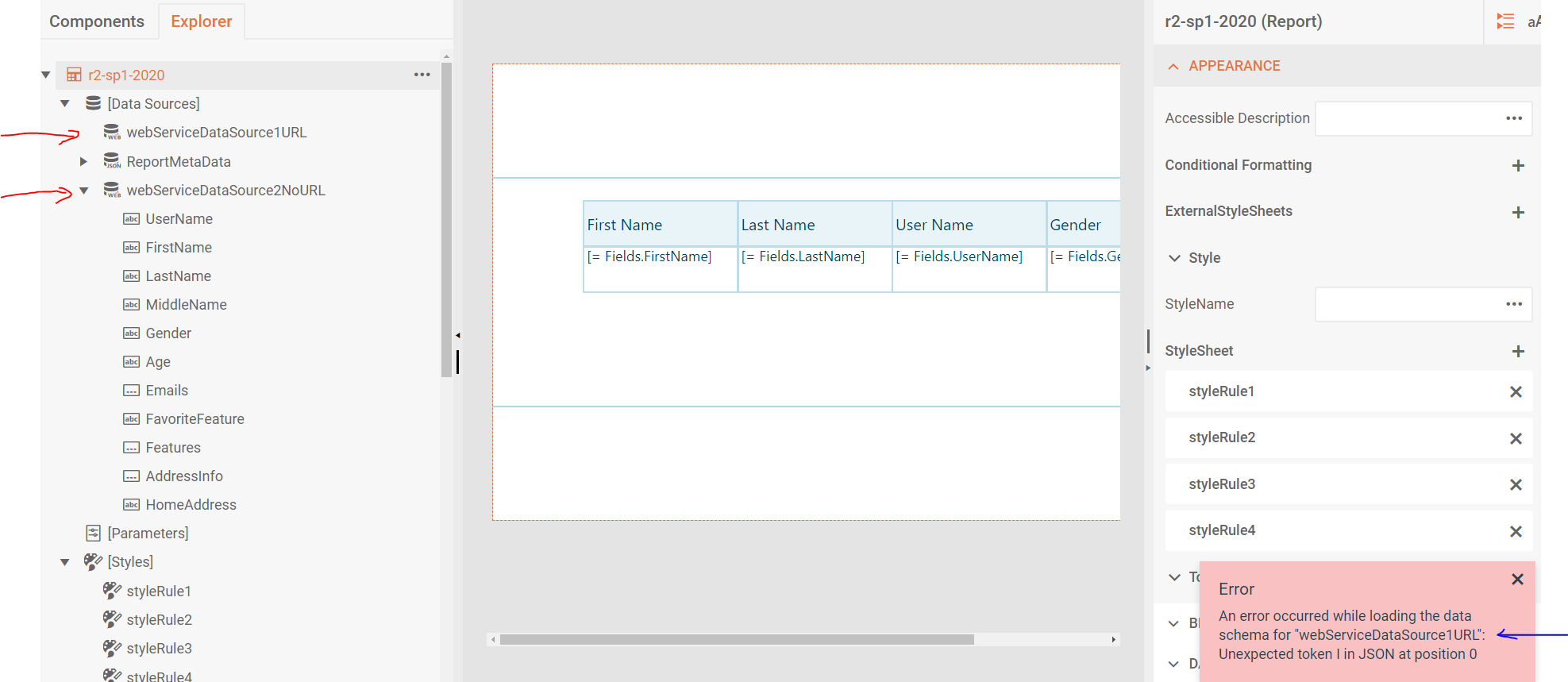 The scenario #1 is not working and the error is showing in a web designer: "An error occurred while loading the data schema for 'webServiceDataSource1URL': unexpected token | in JSON at position 0". For more details check the attached screenshot. As well you can see that the fields for #2 is loaded and for #1 is not loaded. This report works fine in a standalone report designer.