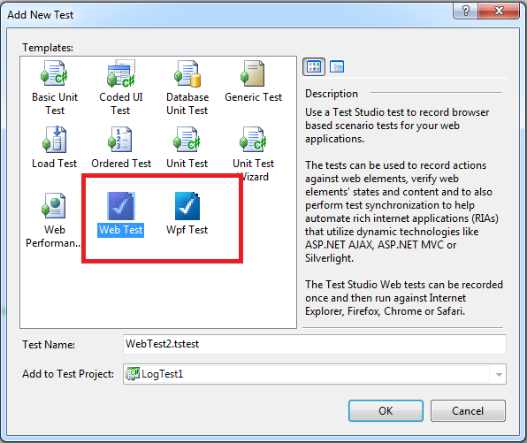 The "Web Test" and the "Wpf Test" are located in the "Add New Test" templates, designated with check icons(see screenshot).