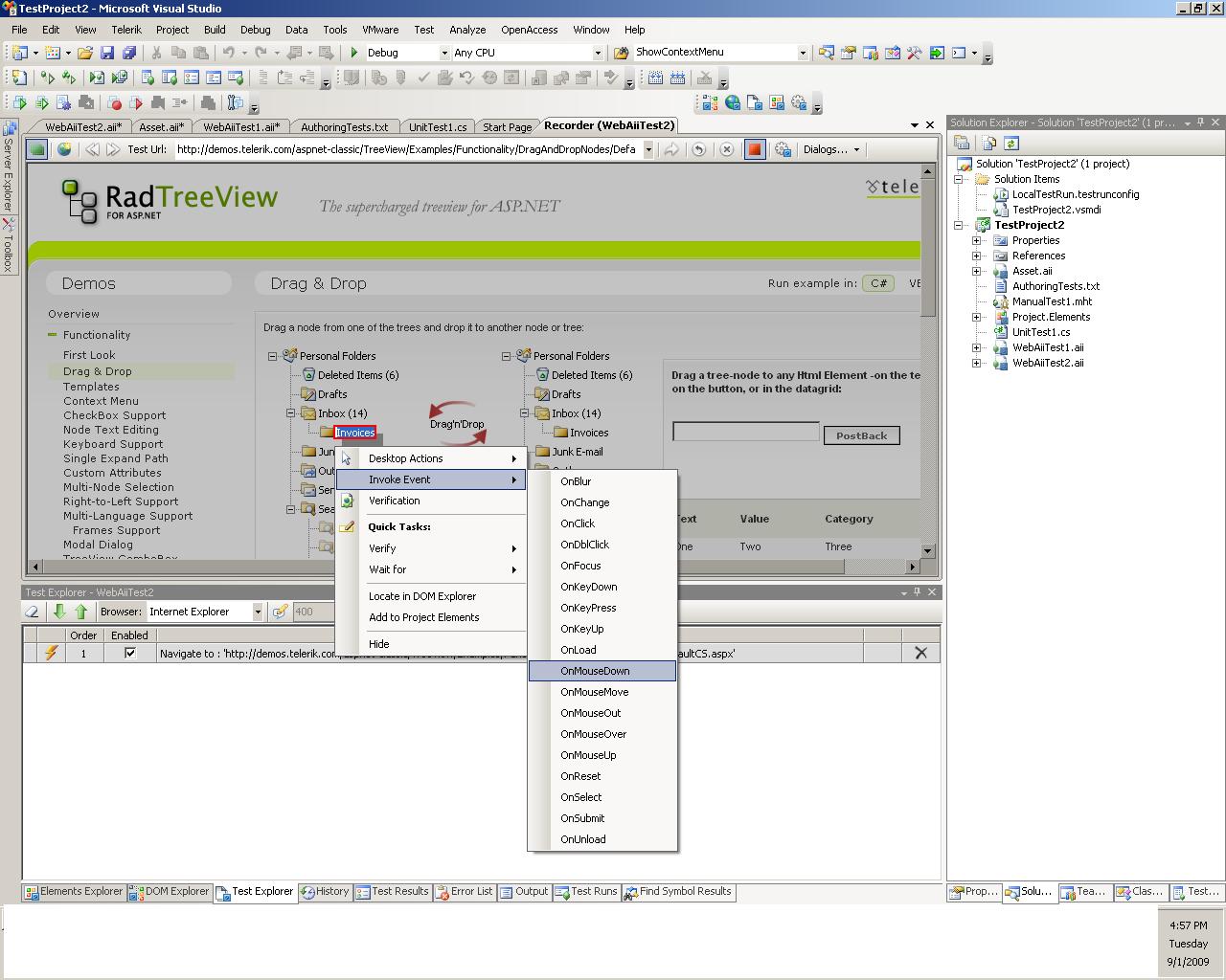 I have two DNN modules. First module "Objects Tree", this module is using Telerik TreeView component. Second module has textbox. I make Drag&Drop one of the tree nodes to the textbox. When I run test, the Drag&Drop does not work. The textbox is empty. I have looked at the Drag&Drop video example, and I have made the same. But Drag&Drop test does not work in my modules.