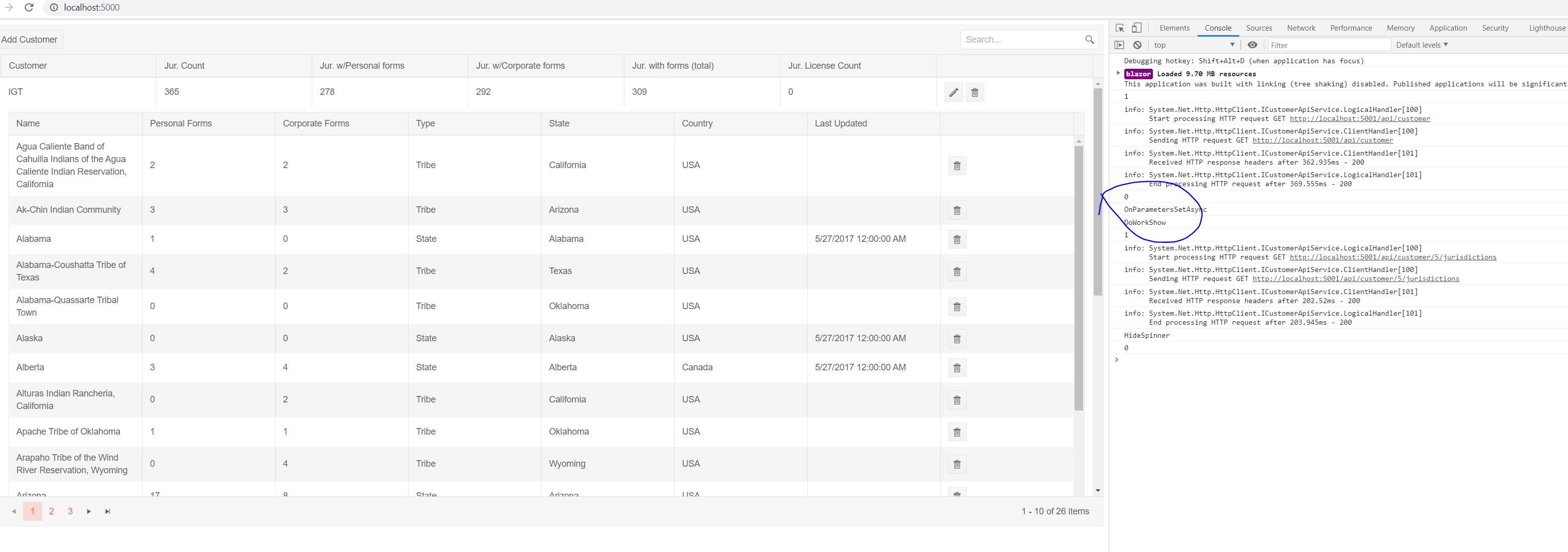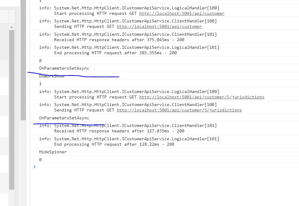 CustomerViewModel JurisdictionsShowblazor.webassembly.js:1 CustomerAvailableJurisdictionsViewModel PopUpShowAsyncblazor.webassembly.js:1 CustomerAvailableJurisdictionsViewModel LoadJurisdictionsblazor.webassembly.js:1 DoWorkShowblazor.webassembly.js:1 1blazor.webassembly.js:1 info: System.Net.Http.HttpClient.ICustomerApiService.LogicalHandler[100] Start processing HTTP request GET http://localhost:5001/api/customer/5/availablejurisdictionsblazor.webassembly.js:1 info: System.Net.Http.HttpClient.ICustomerApiService.ClientHandler[100] Sending HTTP request GET http://localhost:5001/api/customer/5/availablejurisdictionsblazor.webassembly.js:1 CustomerJurisdictionViewModel OnParametersSetAsyncblazor.webassembly.js:1 CustomerJurisdictionViewModel LoadCustomerJurisdictionsAsyncblazor.webassembly.js:1 DoWorkShowblazor.webassembly.js:1 2blazor.webassembly.js:1 info: System.Net.Http.HttpClient.ICustomerApiService.LogicalHandler[100] Start processing HTTP request GET http://localhost:5001/api/customer/5/jurisdictionsblazor.webassembly.js:1 info: System.Net.Http.HttpClient.ICustomerApiService.ClientHandler[100] Sending HTTP request GET http://localhost:5001/api/customer/5/jurisdictionsblazor.webassembly.js:1 CustomerJurisdictionViewModel OnParametersSetAsyncblazor.webassembly.js:1 CustomerJurisdictionViewModel LoadCustomerJurisdictionsAsyncblazor.webassembly.js:1 DoWorkShowblazor.webassembly.js:1 3blazor.webassembly.js:1 info: System.Net.Http.HttpClient.ICustomerApiService.LogicalHandler[100] Start processing HTTP request GET http://localhost:5001/api/customer/6/jurisdictionsblazor.webassembly.js:1 info: System.Net.Http.HttpClient.ICustomerApiService.ClientHandler[100] Sending HTTP request GET http://localhost:5001/api/customer/6/jurisdictionsblazor.webassembly.js:1 CustomerJurisdictionViewModel OnParametersSetAsyncblazor.webassembly.js:1 CustomerJurisdictionViewModel LoadCustomerJurisdictionsAsyncblazor.webassembly.js:1 DoWorkShowblazor.webassembly.js:1 4blazor.webassembly.js:1 info: System.Net.Http.HttpClient.ICustomerApiService.LogicalHandler[100] Start processing HTTP request GET http://localhost:5001/api/customer/7/jurisdictionsblazor.webassembly.js:1 info: System.Net.Http.HttpClient.ICustomerApiService.ClientHandler[100] Sending HTTP request GET http://localhost:5001/api/customer/7/jurisdictionsblazor.webassembly.js:1 CustomerJurisdictionViewModel OnParametersSetAsyncblazor.webassembly.js:1 CustomerJurisdictionViewModel LoadCustomerJurisdictionsAsyncblazor.webassembly.js:1 DoWorkShowblazor.webassembly.js:1 5blazor.webassembly.js:1 info: System.Net.Http.HttpClient.ICustomerApiService.LogicalHandler[100] Start processing HTTP request GET http://localhost:5001/api/customer/15/jurisdictionsblazor.webassembly.js:1 info: System.Net.Http.HttpClient.ICustomerApiService.ClientHandler[100] Sending HTTP request GET http://localhost:5001/api/customer/15/jurisdictionsblazor.webassembly.js:1 info: System.Net.Http.HttpClient.ICustomerApiService.ClientHandler[101] Received HTTP response headers after 311.525ms - 200blazor.webassembly.js:1 info: System.Net.Http.HttpClient.ICustomerApiService.LogicalHandler[101] End processing HTTP request after 312.7ms - 200blazor.webassembly.js:1 info: System.Net.Http.HttpClient.ICustomerApiService.ClientHandler[101] Received HTTP response headers after 294.95ms - 200blazor.webassembly.js:1 info: System.Net.Http.HttpClient.ICustomerApiService.LogicalHandler[101] End processing HTTP request after 296.1749ms - 200blazor.webassembly.js:1 info: System.Net.Http.HttpClient.ICustomerApiService.ClientHandler[101] Received HTTP response headers after 290.9249ms - 200blazor.webassembly.js:1 info: System.Net.Http.HttpClient.ICustomerApiService.LogicalHandler[101] End processing HTTP request after 292.05ms - 200blazor.webassembly.js:1 info: System.Net.Http.HttpClient.ICustomerApiService.ClientHandler[101] Received HTTP response headers after 285.2199ms - 200blazor.webassembly.js:1 info: System.Net.Http.HttpClient.ICustomerApiService.LogicalHandler[101] End processing HTTP request after 286.74ms - 200blazor.webassembly.js:1 info: System.Net.Http.HttpClient.ICustomerApiService.ClientHandler[101] Received HTTP response headers after 264.67ms - 200blazor.webassembly.js:1 info: System.Net.Http.HttpClient.ICustomerApiService.LogicalHandler[101] End processing HTTP request after 265.7349ms - 200blazor.webassembly.js:1 DoWorkHideblazor.webassembly.js:1 4blazor.webassembly.js:1 CustomerAvailableJurisdictionsViewModel PopUpShowAsync WindowJurisdictionsPopUpVisible: True4blazor.webassembly.js:1 CustomerJurisdictionViewModel OnParametersSetAsyncblazor.webassembly.js:1 HideSpinnerblazor.webassembly.js:1 3blazor.webassembly.js:1 HideSpinnerblazor.webassembly.js:1 2blazor.webassembly.js:1 HideSpinnerblazor.webassembly.js:1 1blazor.webassembly.js:1 HideSpinnerblazor.webassembly.js:1 0