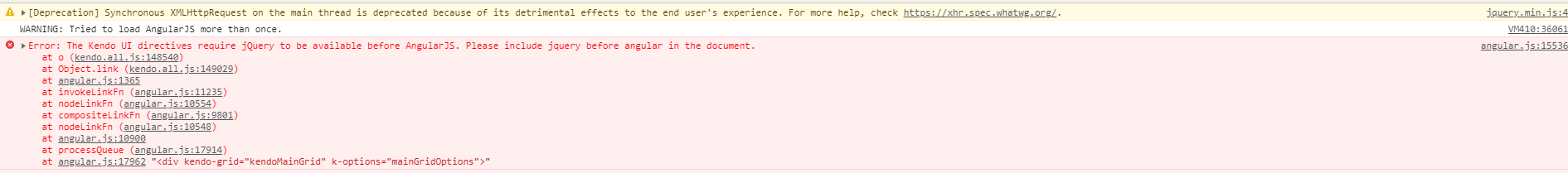 I am not able to produce the issue in your snippet. Here is the list of references I am using in my project. Here I am using angular routing concept.In the second page I have kendo grid, there it is showing error.