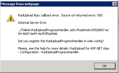 1 - on the SubmitButton_Click (Upload Files), i receive a message error that you can see in file attached "Immagine 1"; the file is correctly uploaded as i can see in debug (RadUpload1.UploadedFiles contains the element i've uploaded) but i don't want to see anymore this message error; i've just watched following posts about this matter: http://www.telerik.com/forums/277270-radupload-ajax-callback-error-source-url-returned-invalid-content - http://www.telerik.com/forums/radupload-ajax-callback-erro-source-url-returned-invalid-content but neither help me to solve the problem.