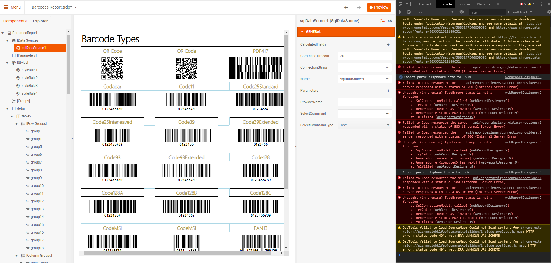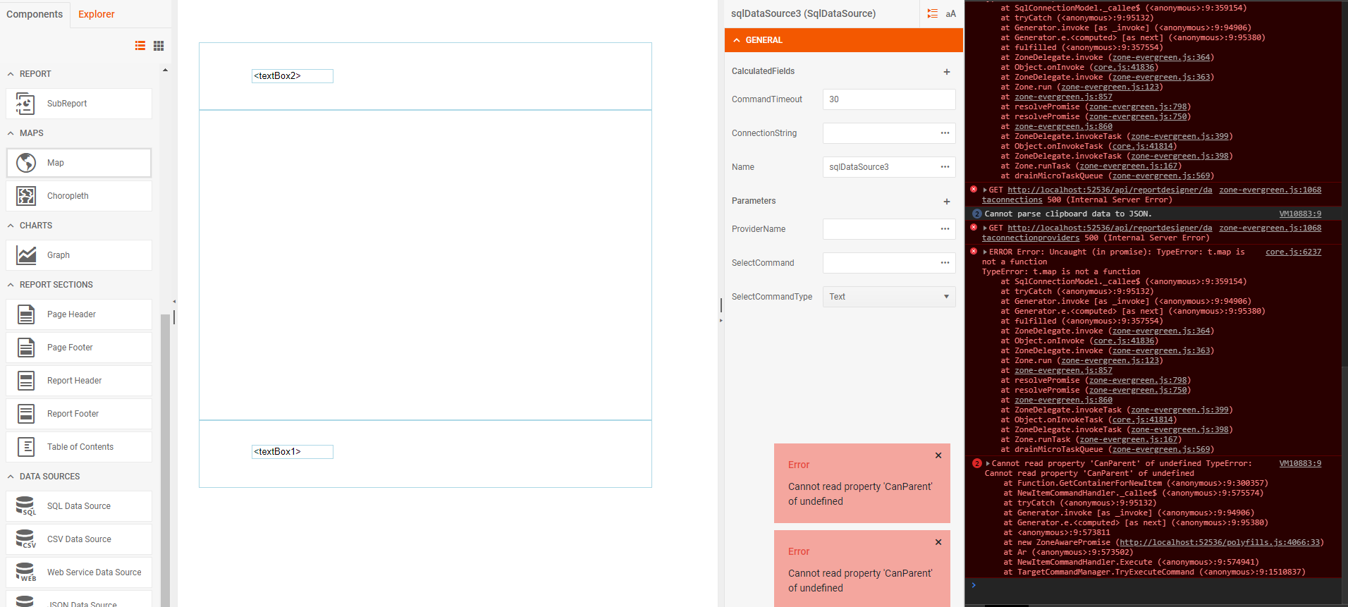 In the code provided look at the errors for example trying to edit aSqlDataSource in the designer.