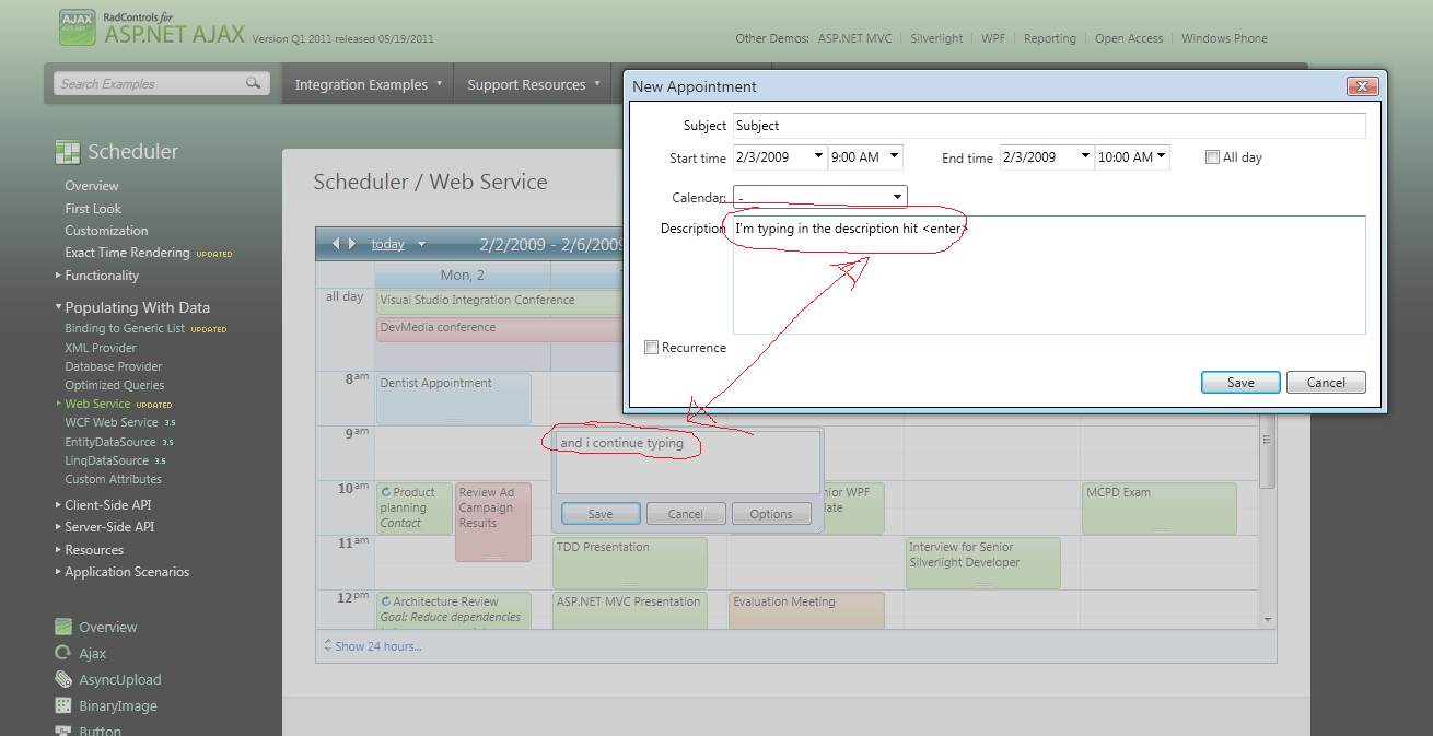 So my problem is similar to this in that I'm using the scheduler and webservices, when inserting, and I hit enter anywhere on the insert form (inside a multiline textbox for example) the form posts back, losing all data on it. When in edit mode the form behaves as it should, and just adds another line the textbox. I have not been able to intercept the enter key either, though any client side script on the insert, but during edit the form behaves as I would expect. My problem that the multiline text boxes do not function on the insert form, but do on the edit form.