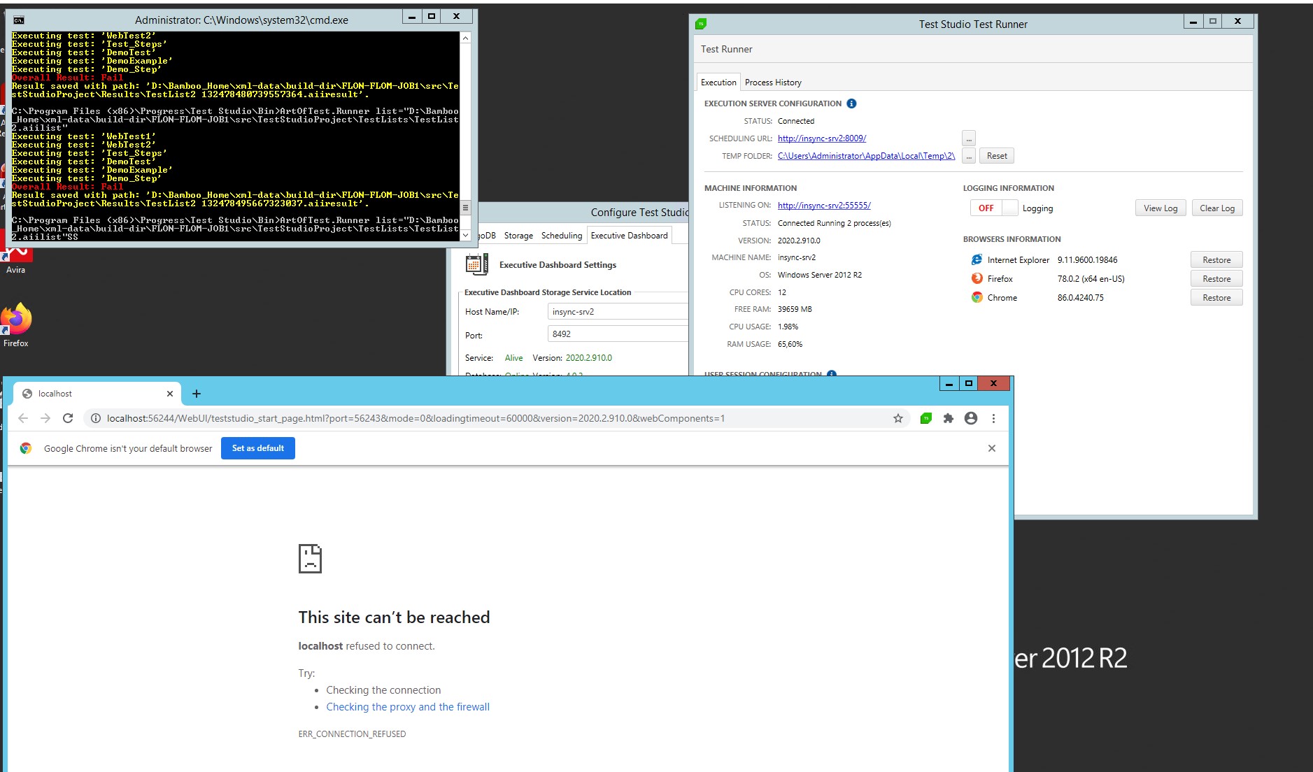 - In case this process is not started, please, enable the logging from the Test Runner and execute the Bamboo task once again. Once the browser returns the same message that the localhost cannot be reached, you can close it and then collect the log generated so far. Please, send this zipped via this thread.