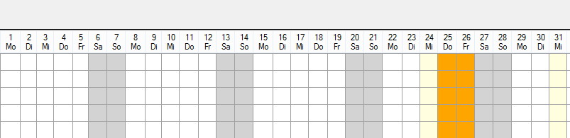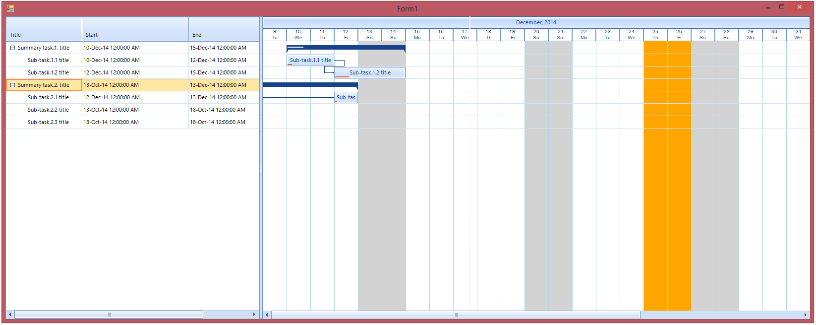 public partial class Form1 : Form{ public Form1() { InitializeComponent(); //this.LoadData(); this.radGanttView1.GanttViewElement.GraphicalViewElement.TimelineRange = TimeRange.Month; this.Load += Form1_Load; this.radGanttView1.GraphicalViewItemFormatting += radGanttView1_GraphicalViewItemFormatting; this.radGanttView1.TimelineItemFormatting += radGanttView1_TimelineItemFormatting; ((CustomGanttViewGraphicalViewElement)this.radGanttView1.GanttViewElement.GraphicalViewElement).SpecialDates.Add(new DateTime(2014, 12, 25)); ((CustomGanttViewGraphicalViewElement)this.radGanttView1.GanttViewElement.GraphicalViewElement).SpecialDates.Add(new DateTime(2014, 12, 26)); } Font font = new Font("Arial",7.5f); private void radGanttView1_TimelineItemFormatting(object sender, GanttViewTimelineItemFormattingEventArgs e) { DateTime date; LightVisualElement element; for (int i = 0; i < e.ItemElement.Children[1].Children.Count; i++) { date = e.ItemElement.Data.Start.AddDays(i); element = e.ItemElement.Children[1].Children[i] as LightVisualElement; if (element!=null) { element.Text = date.Day + "\n" + date.DayOfWeek.ToString().Substring(0, 2); element.Font = font; } } } void radGanttView1_GraphicalViewItemFormatting(object sender, GanttViewGraphicalViewItemFormattingEventArgs e) { e.ItemElement.DrawFill = false; }}I have also attached a screenshot of what the result is on my side.