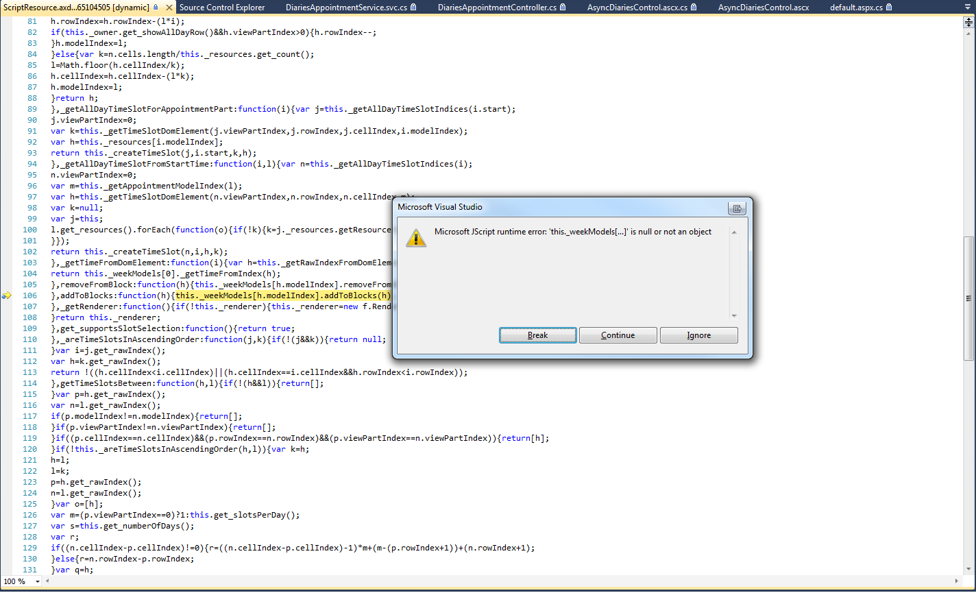 Also, if I set the scheduler to show DayView by default and then click on the WeekView button on the scheduler it renders as attached (halfrender.png) but also gives an error in Visual Studio (vserror.png)