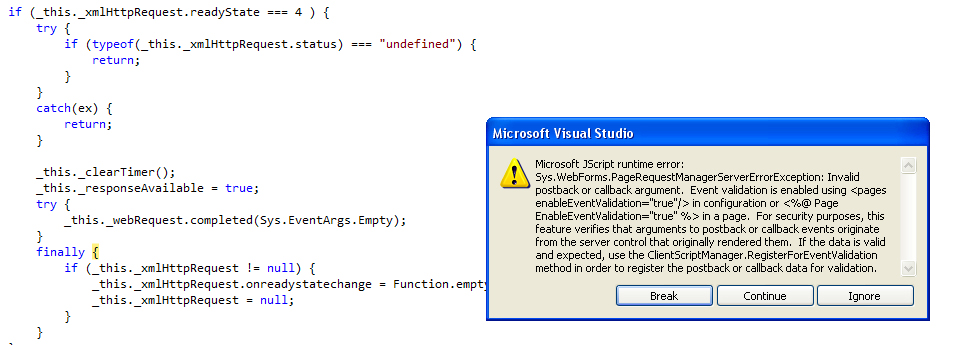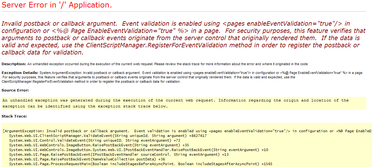 guys, it's like something grew overnight on this grid and i just can't figure it out. hopefully ya'll might be able to point me in the right direction. any button on this grid (below) gets the error attached. (invalid postback or callback error). it's sad but this code has sat there for a while unchanged and was working just fine... and then the error (attached) just started. it only happens with the editCommand button or the asp:ImageButton and frankly i can put anykind of button and the "click event" - i assume is triggering this - even if there is no method attached to the button itself. everything else works just fine - menu items etc. has anyone seen this before or knows the cause of this?