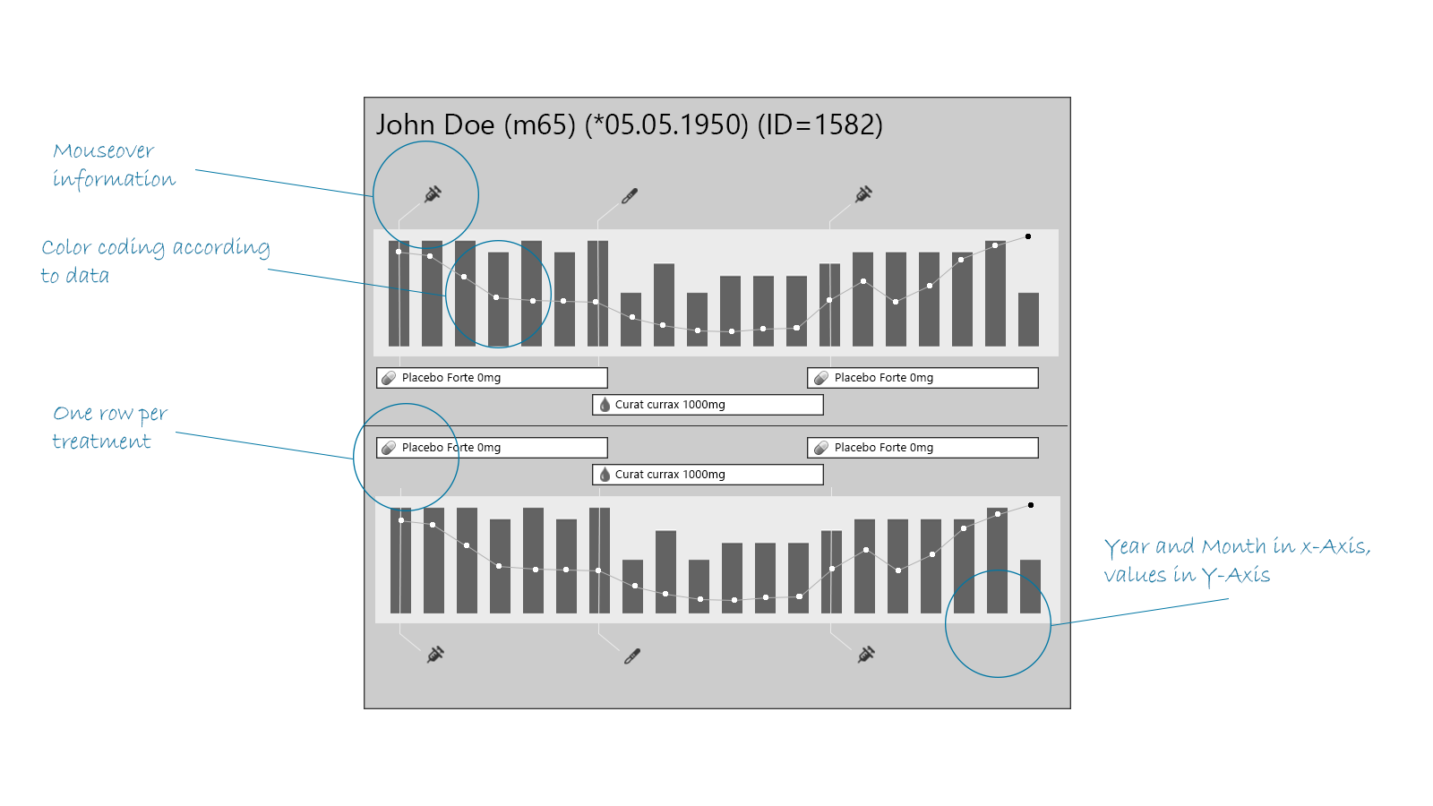 The vertical bar and line graphs are easily done with the RadCartesianChart. However, what I'm missing is a chart, that can display the treatments (Placebo Forte et al.) and the treatments (syringe and scalpel). It's important for them to align with the chart, since they share the same timeline.