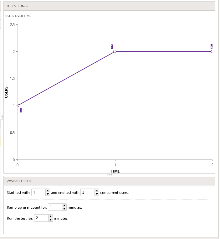 In the screenshot for a datadriven test for a simple login and logout (5000 unique user credentials, but my Virtual User is limited to 100 in the trial version), I ran for 2 minutes, ramping up from 1 to 2 users in 1 minute.