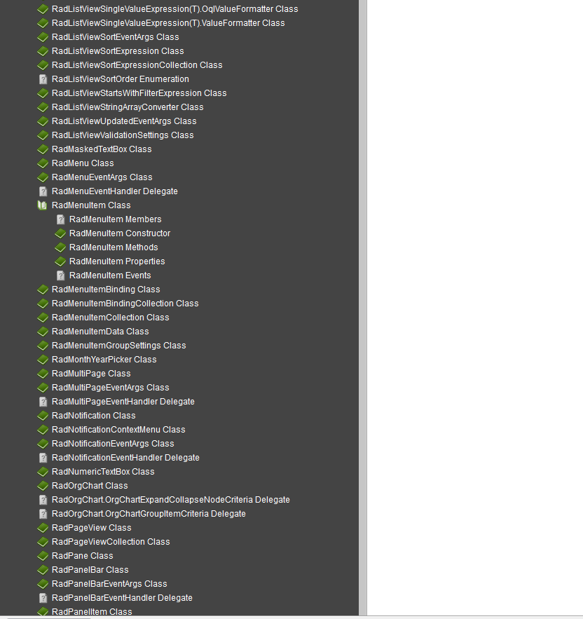 I swear I used to be able to find a list of all server side properties and methods of every telerik control. Now all I can find is client in the documentation. What happened to the lists of all the server properties and methods?? You guys don't provide any intelisense support so the ONLY thing I have is your online documentation. Which I can't find today for some reason.
