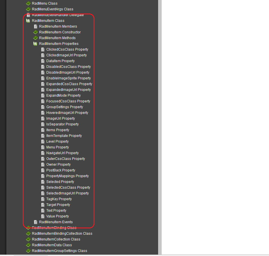 Please refer to the attached images that shows where in our on-line documentation you can find a complete reference to the methods and properties of the controls. When you expand the Telerik.Web.UI Namespace (Menu1.png) directory, you can scroll down till you find the necessary control (in my example this is the RadMenu control).