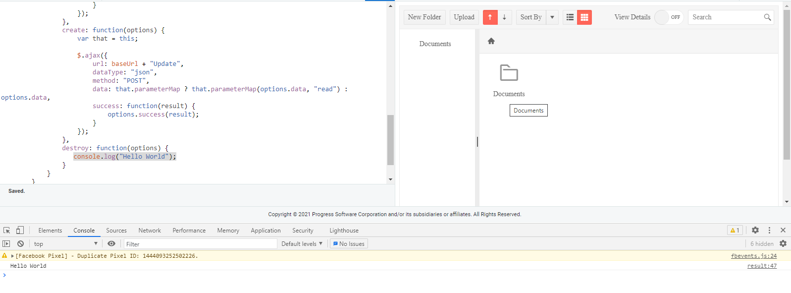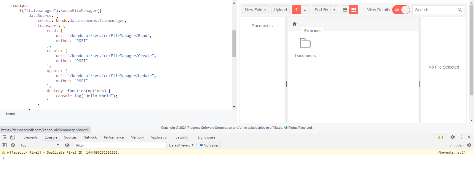 Each link uses a different method of Kendo FileManager. But, with Second link, I can call function.