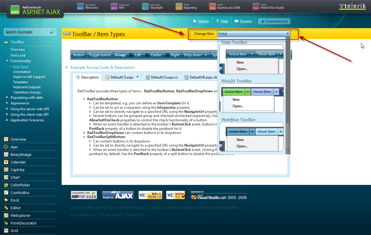 This question doesn't just apply to the Toolbar but to virtually every other control as well. I looked in the documentation as well as this forum and cannot find the listing of skin names. With the older version of the Rad Controls, Telerik had a demo site that allowed the user to view all the available skins. Why in the world did you leave that out when you updated the newer demo site??