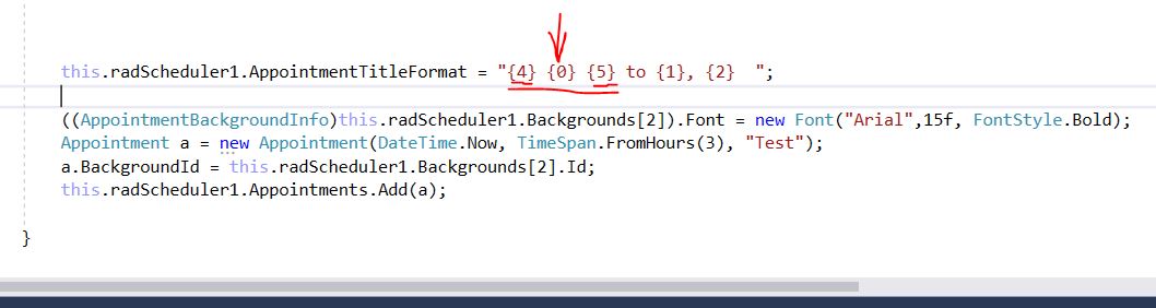 this.radScheduler1.AppointmentTitleFormat = "{0} to {1}, {2} {4} {5}";((AppointmentBackgroundInfo)this.radScheduler1.Backgrounds[2]).Font = new Font("Arial", 12f, FontStyle.Bold);Appointment a = new Appointment(DateTime.Now, TimeSpan.FromHours(3), "Test");a.BackgroundId = this.radScheduler1.Backgrounds[2].Id;this.radScheduler1.Appointments.Add(a);If you use another background for the appointment, this font won't be applied to the event.