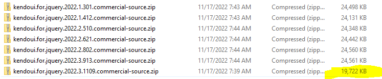 I checked in the size of the kendoui.for.jquery.2022.3.1109.commercial.zip and as you can see in the screencast linked here, the size is similar to the other Kendo version commercial.zip files. Also when the zip is downloaded the kendo.all.min.js file is available. Please let me know if I am missing something. What are the options in your Telerik profile when you select the 2022.3.1109 vKendo version?