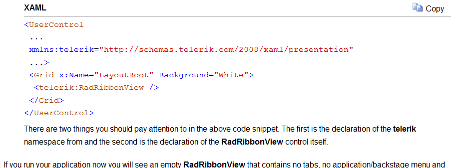 if I look at the "Getting Started" section of RadRibbonView it tells me,