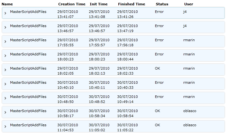 Hello, I want to develop an application for Silverlight 4 that shows a list of workflows in a hierarchical structure, but when a row is expanded it must show also some custom information. To understand the application better I have attached 2 pictures: The first one shows all the list of workflows collapsed, and in the second one I have expanded some of the workflows and some of them have a hiercarchical structure. (for example "SharerScript" is inside "MasterScript").