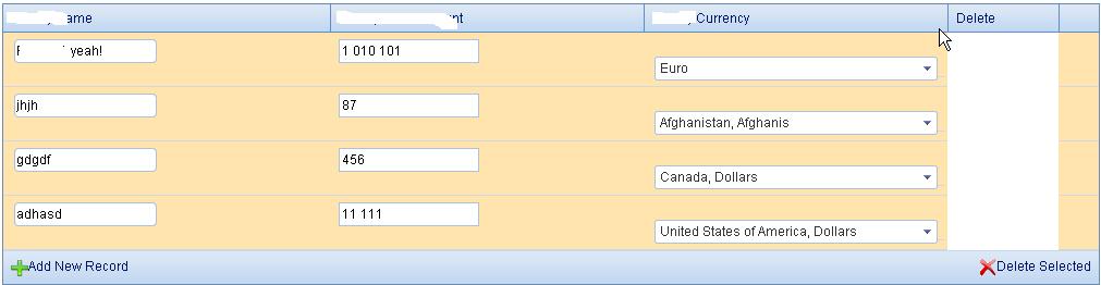 <telerik:RadGrid ID="radgrid1" AutoGenerateColumns="False" runat="server" GridLines="None" Skin="Office2007" CellSpacing="0" DataSourceID="radgrid1DataSource" OnItemInserted="radgrid1_ItemInserted" AllowAutomaticInserts="true" OnItemDataBound="radgrid1_ItemDataBound" OnItemCommand="radgrid1_ItemCommand" AllowAutomaticDeletes="true" ValidationSettings-EnableValidation="false"> <MasterTableView DataKeyNames="KeyID" EditMode="InPlace" AllowAutomaticInserts="true" AllowAutomaticDeletes="true"> <Columns> <telerik:GridBoundColumn DataField="KeyID" Visible="false" UniqueName="KeyID" HeaderText="<%$ Resources:GlobalResources, KeyID %>" /> <telerik:GridBoundColumn DataField="ProjectID" Visible="false" UniqueName="ProjectID" HeaderText="<%$ Resources:GlobalResources, ProjectID %>" /> <telerik:GridBoundColumn DataField="Name" UniqueName="Name" HeaderText="<%$ Resources:GlobalResources, Name%>" /> <telerik:GridNumericColumn DataField="InitialAmount" NumericType="Number" DataFormatString="{0:N}" DecimalDigits="2" UniqueName="InitialAmount" HeaderText="<%$ Resources:GlobalResources, InitialAmount%>" /> <telerik:GridTemplateColumn UniqueName="CurrencyCode" ItemStyle-Width="260px" HeaderText="<%$ Resources:GlobalResources, CurrencyCode %>"> <ItemTemplate> <%# DataBinder.Eval(Container.DataItem, "CurrencyCode") %> </ItemTemplate> <EditItemTemplate> <cc:CurrencyDropDownList ID="ddlCurrency" runat="server" IsAlertsVisible="false" IsLockVisible="false" IsHistoryVisible="false" IsFieldLabelVisible="false" IsReadOnly="false" IncludeNullValue="false" MyDropDownList-SelectedValue='<%# Bind("CurrencyCode") %>' /> </EditItemTemplate> </telerik:GridTemplateColumn> <telerik:GridCheckBoxColumn DataField="ToDelete" UniqueName="ToDelete" HeaderText="Delete" /> <telerik:GridEditCommandColumn ButtonType="PushButton" InsertText="Confirm" EditText="Edit" CancelText="Cancel" UniqueName="EditCommandColumn" /> </Columns> <NoRecordsTemplate> No Records Found. </NoRecordsTemplate> <CommandItemTemplate> <table cellpadding="5" style="width: 100%"> <tr> <td align="left"> <asp:LinkButton ID="btnAddNewRecord" runat="server" CommandName="InitInsert"> <img style="border:0px" alt="" src="../Images/add.png" />Add New Record </asp:LinkButton> </td> <td align="right"> <asp:LinkButton ID="btnDeleteSelected" runat="server" CommandName="DeleteSelected" OnClientClick="javascript:return confirm('Delete all selected records?')"> <img src="../Images/delete.png" alt="" style="border:0px" />Delete Selected </asp:LinkButton> </td> </tr> </table> </CommandItemTemplate> </MasterTableView></telerik:RadGrid>Here's some of the only relevant C# code (i.e. relevant to the ToDelete column and the grid itself):