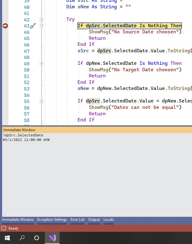 <telerik:RadMonthYearPicker ID="RadMonthYearPicker1" runat="server" SelectedDate="2016/5/5 12:00"> <DateInput runat="server" ></DateInput> </telerik:RadMonthYearPicker> <asp:Button Text="Get Date" OnClick="Unnamed_Click" runat="server" /> <asp:TextBox runat="server" ID="DateValue"/>protected void Unnamed_Click(object sender, EventArgs e) { DateValue.Text = RadMonthYearPicker1.SelectedDate; }Can you share the declaration of the control on your side? It could be something date input formatting or even Culture related - see https://docs.telerik.com/devtools/aspnet-ajax/controls/monthyearpicker/functionality/formatting-values?
