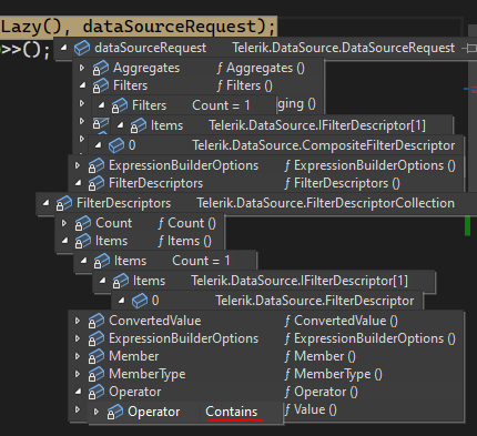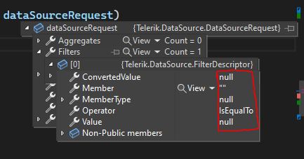 However, in GetLazy() the filters are not. The correct amount of filters is set, but every set filter is empty with the operator IsEqualTo.