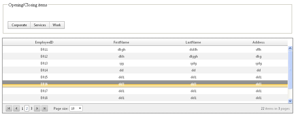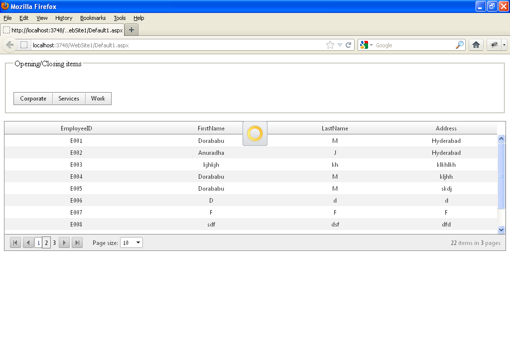 <%@ Page Language="C#" AutoEventWireup="true" CodeFile="Default1.aspx.cs" Inherits="_Default1" %><%@ Register Assembly="Telerik.Web.UI" Namespace="Telerik.Web.UI" TagPrefix="telerik" %><!DOCTYPE html PUBLIC "-//W3C//DTD XHTML 1.0 Transitional//EN" "http://www.w3.org/TR/xhtml1/DTD/xhtml1-transitional.dtd"><html xmlns="http://www.w3.org/1999/xhtml"><head runat="server"> <title></title> <link href="Grid.Office2010Silver.css" rel="stylesheet" type="text/css" /> <link href="Ajax.Office2010Silver.css" rel="stylesheet" type="text/css" /></head><body> <form id="form1" runat="server"> <telerik:RadScriptManager ID="RadScriptManager1" runat="server" /> <div> <telerik:RadAjaxManager ID="RadAjaxManager1" runat="server"> <AjaxSettings> <telerik:AjaxSetting AjaxControlID="RadGrid1"> <UpdatedControls> <telerik:AjaxUpdatedControl ControlID="RadGrid1" LoadingPanelID="RadAjaxLoadingPanel1" /> </UpdatedControls> </telerik:AjaxSetting> </AjaxSettings> </telerik:RadAjaxManager> <telerik:RadAjaxLoadingPanel ID="RadAjaxLoadingPanel1" runat="server" Visible="true" CssClass="RadAjax_Office2010Silver" MinDisplayTime="2000" Transparency="1"> <asp:Image ID="img" runat="server" ImageUrl="~/loading.gif" /> </telerik:RadAjaxLoadingPanel> <telerik:RadGrid ID="RadGrid1" ShowFooter="false" CssClass="RadGrid_Office2010Silver" AllowMultiRowSelection="false" OnItemCommand="RadGrid1_ItemCommand" AllowPaging="true" AllowSorting="true" PageSize="10" runat="server" OnPageIndexChanged="RadGrid1_PageIndexChanged" EnableAjaxSkinRendering="false" AllowCustomPaging="True" OnPageSizeChanged="RadGrid1_PageSizeChanged" OnNeedDataSource="RadGrid1_NeedDataSource"> <PagerStyle Mode="NextPrevAndNumeric" /> <ClientSettings EnableRowHoverStyle="true"> <Scrolling AllowScroll="True" UseStaticHeaders="True" ScrollHeight="200" SaveScrollPosition="true" FrozenColumnsCount="3"></Scrolling> <Selecting AllowRowSelect="true" /> </ClientSettings> <MasterTableView DataKeyNames="EmployeeID" AutoGenerateColumns="false"> <Columns> <telerik:GridBoundColumn DataField="EmployeeID" UniqueName="EmployeeID" HeaderText="EmployeeID" HeaderStyle-HorizontalAlign="Center" ItemStyle-HorizontalAlign="Center"> </telerik:GridBoundColumn> <telerik:GridBoundColumn DataField="FirstName" HeaderStyle-HorizontalAlign="Center" ItemStyle-HorizontalAlign="Center" UniqueName="FirstName" HeaderText="FirstName"> </telerik:GridBoundColumn> <telerik:GridBoundColumn DataField="LastName" UniqueName="LastName" HeaderText="LastName" HeaderStyle-HorizontalAlign="Center" ItemStyle-HorizontalAlign="Center"> </telerik:GridBoundColumn> <telerik:GridBoundColumn DataField="Address" UniqueName="Address" HeaderText="Address" HeaderStyle-HorizontalAlign="Center" ItemStyle-HorizontalAlign="Center"> </telerik:GridBoundColumn> </Columns> </MasterTableView> </telerik:RadGrid> </div> </form></body></html>