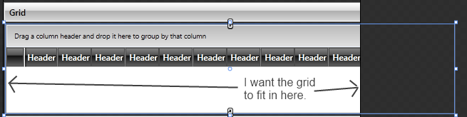 <telerik:RadPanelBar> <telerik:RadPanelBarItem IsExpanded="True"> <telerik:RadPanelBarItem.Header> <TextBlock Text="Grid"/> </telerik:RadPanelBarItem.Header> <telerik:RadGridView > <telerik:RadGridView.Columns> <telerik:GridViewColumn Header="Header"> </telerik:GridViewColumn> <telerik:GridViewColumn Header="Header"> </telerik:GridViewColumn> <telerik:GridViewColumn Header="Header"> </telerik:GridViewColumn> <telerik:GridViewColumn Header="Header"> </telerik:GridViewColumn> <telerik:GridViewColumn Header="Header"> </telerik:GridViewColumn> <telerik:GridViewColumn Header="Header"> </telerik:GridViewColumn> <telerik:GridViewColumn Header="Header"> </telerik:GridViewColumn> <telerik:GridViewColumn Header="Header"> </telerik:GridViewColumn> <telerik:GridViewColumn Header="Header"> </telerik:GridViewColumn> <telerik:GridViewColumn Header="Header"> </telerik:GridViewColumn> </telerik:RadGridView.Columns> </telerik:RadGridView> </telerik:RadPanelBarItem></telerik:RadPanelBar>I have tried binding the width of the RadGridView to the ActualWidth of the RadPanelBar which gets close but is off by a few pixels due to the margin around the RadPanelBarItem content. I'd prefer a solution which doesn't involve binding the width of the grid.