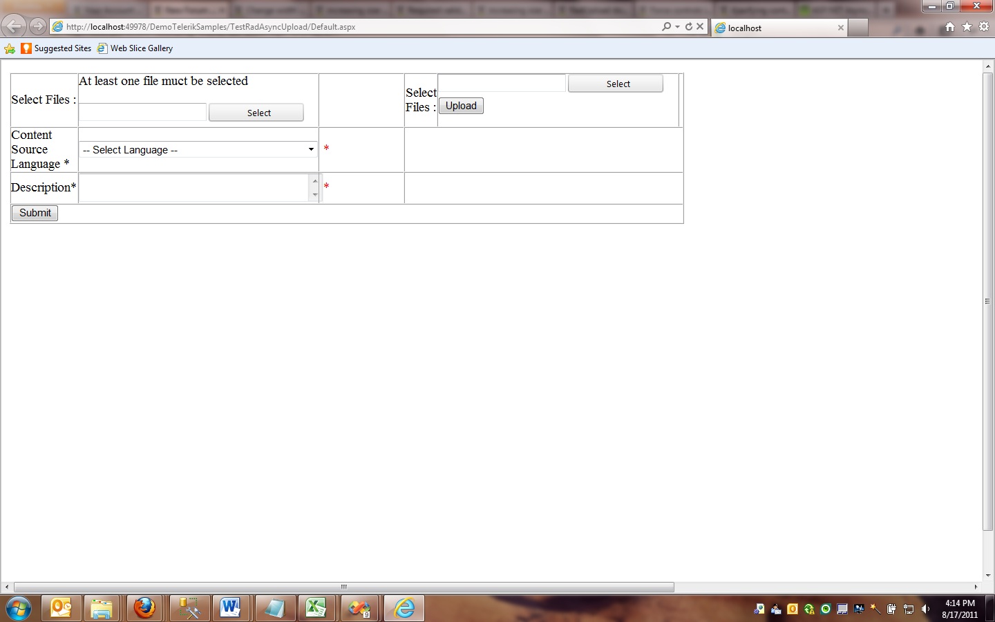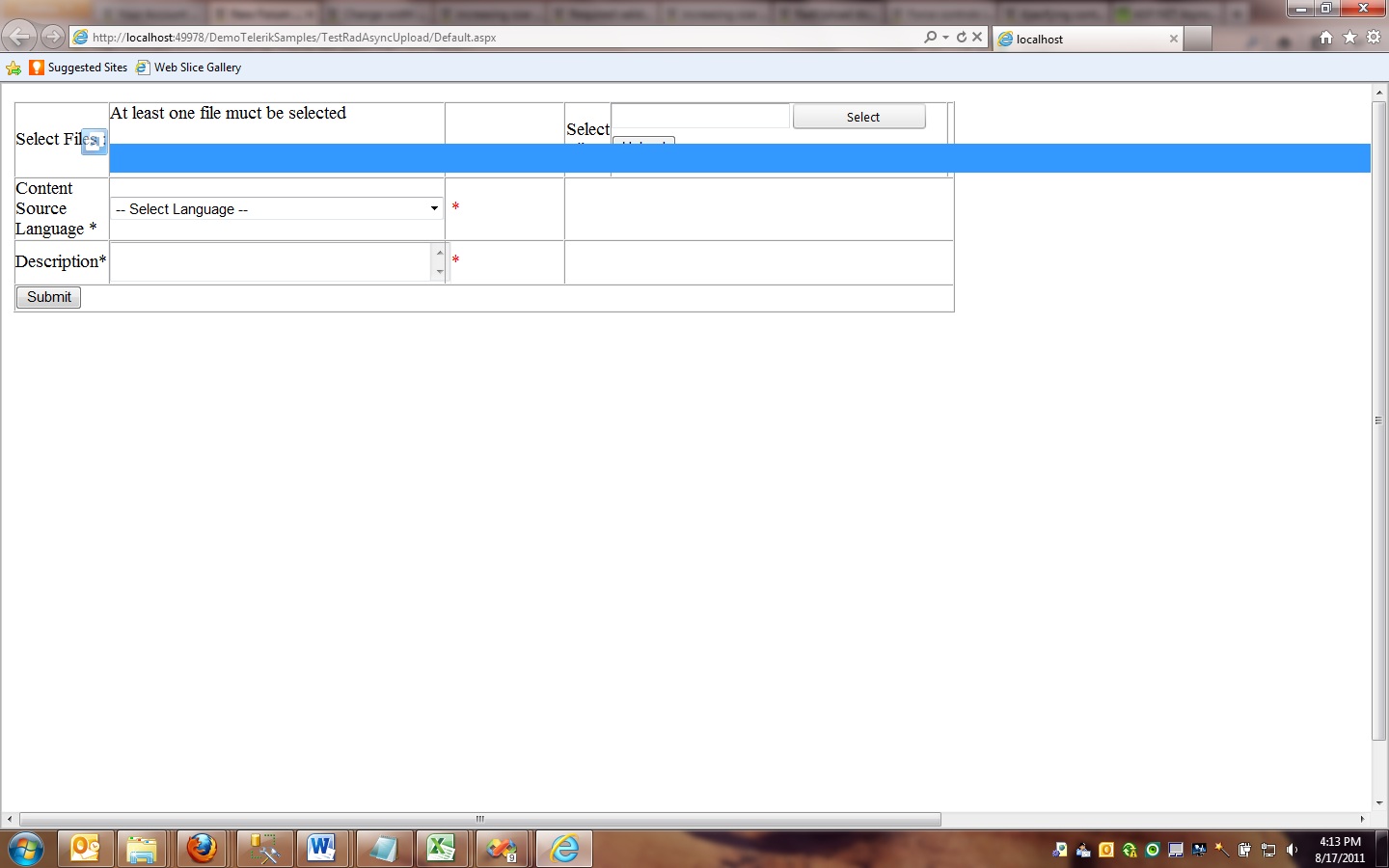<%@ Page Language="C#" AutoEventWireup="true" CodeFile="Default.aspx.cs" Inherits="TestRadAsyncUpload_Default" %><!DOCTYPE html PUBLIC "-//W3C//DTD XHTML 1.0 Transitional//EN" "http://www.w3.org/TR/xhtml1/DTD/xhtml1-transitional.dtd"><html xmlns="http://www.w3.org/1999/xhtml"><head runat="server"> <title></title> <style type="text/css"> .ruBrowse { background-position: 0 -46px !important; width: 122px !important; } </style></head><body> <form id="form1" runat="server"> <telerik:RadScriptManager ID="RadScriptManager1" runat="server"> </telerik:RadScriptManager> <telerik:RadAjaxPanel ID="ajaxPanel" runat="server" LoadingPanelID="RadAjaxLoadingPanel1"> <table width="70%" cellpadding="0" cellspacing="0" border="1"> <tr> <td style="width: 30%"> Select Files : </td> <td style="width: 30%; "> <%--<telerik:RadAsyncUpload ID="uploadRefAndInstrucs" AllowedFileExtensions="doc,docx,xls,xlsx,pdf,zip,rar,tar,gz" runat="server" > </telerik:RadAsyncUpload>--%> At least one file muct be selected<br /> <br /> <telerik:RadAsyncUpload ID="uploadRefAndInstrucs" runat="server" Width="190px" CssClass="ruBrowse" > </telerik:RadAsyncUpload> <%-- <telerik:RadUpload ID="uploadRefAndInstrucs" runat="server" > </telerik:RadUpload>--%> </td> <td style="width: 40%"> </td> <td style="width: 30%"> Select Files : </td> <td valign="top" style="width: 30%; "> <%--<telerik:RadAsyncUpload ID="uploadRefAndInstrucs" AllowedFileExtensions="doc,docx,xls,xlsx,pdf,zip,rar,tar,gz" runat="server" > </telerik:RadAsyncUpload>--%> <telerik:RadAsyncUpload ID="RadAsyncUpload1" runat="server" Width="190px" CssClass="ruBrowse" > </telerik:RadAsyncUpload> <asp:Button ID="btnUpload" runat="server" CausesValidation="false" Text="Upload" OnClick="btnUploadAnotherLanguage_Click" /> <%-- <telerik:RadUpload ID="uploadRefAndInstrucs" runat="server" > </telerik:RadUpload>--%> </td> <td style="width: 40%"> </td> </tr> <tr> <td style="width: 30%"> <asp:Label runat="server" ID="lblContentSource" Text="Content Source Language *" Width="100%"></asp:Label> </td> <td style="width: 30%"> <asp:DropDownList runat="server" ID="ddlCotentSourceLanguage" Width="100%"> <asp:ListItem Text="-- Select Language --" Value="0"></asp:ListItem> <asp:ListItem Text="Canada" Value="1"></asp:ListItem> <asp:ListItem Text="USA" Value="2"></asp:ListItem> <asp:ListItem Text="China" Value="3"></asp:ListItem> </asp:DropDownList> </td> <td style="width: 20%"> <asp:RequiredFieldValidator ID="ReqContentSourceLanguage" ValidationGroup="UpdateGroup" ToolTip="Content source language is required." runat="server" ControlToValidate="ddlCotentSourceLanguage" InitialValue="0" Text="*" Display="Dynamic" ErrorMessage="Select content source language."></asp:RequiredFieldValidator> </td> <td colspan="3" style="width: 20%"> </td> </tr> <tr> <td align="right"> <asp:Label ID="lblDescription" runat="server" Text="Description*"></asp:Label> </td> <td style="width: 25%"> <asp:TextBox ID="txtDescription" runat="server" TextMode="MultiLine" Width="100%"></asp:TextBox> </td> <td> <asp:RequiredFieldValidator ID="ReqDescription" runat="server" ValidationGroup="UpdateGroup" ControlToValidate="txtDescription" Display="Dynamic" Text="*" ErrorMessage="Enter description."></asp:RequiredFieldValidator> </td> <td colspan="3" style="width: 20%"> </td> </tr> <tr> <td colspan="6"> <asp:Button ID="btnUploadAnotherLanguage" runat="server" ValidationGroup="UpdateGroup" Text="Submit" OnClick="btnUploadAnotherLanguage_Click" /> </td> </tr> </table> </telerik:RadAjaxPanel> <telerik:RadAjaxLoadingPanel ID="RadAjaxLoadingPanel1" runat="server"> </telerik:RadAjaxLoadingPanel> </form></body></html>Thanks