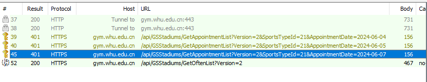 I sned frequent requests between https://gym.whu.edu.cn/api/GSStadiums/GetAppointmentList?Version=2&SportsTypeId=21&AppointmentDate=2024-06-04 and https://gym.whu.edu.cn/api/GSStadiums/GetAppointmentList?Version=2&SportsTypeId=21&AppointmentDate=2024-06-05, I set up an auto-save to txt function,I can see the response in the fiddler, in the firtst two request ,i can see the response in the txt,but in the following request, the txt do not update,until over several times , i do it again ,it can be updated, I do want to know why this happen. Addly,if i do the request https://gym.whu.edu.cn/api/GSStadiums/GetAppointmentList?Version=2&SportsTypeId=21&AppointmentDate=2024-06-04 and https://gym.whu.edu.cn/api/GSStadiums/GetOftenList?Version=2 ,i can see the update in real time.