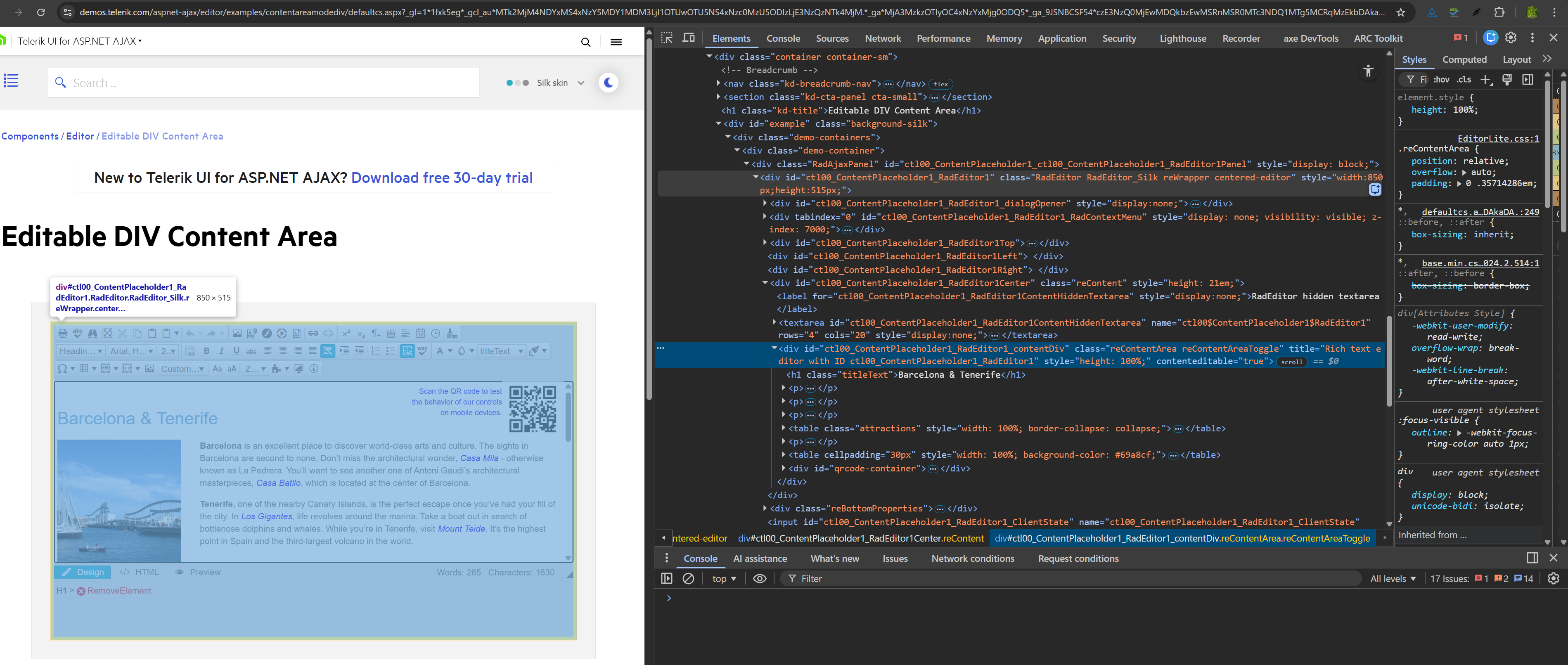 Examples like Telerik Web UI Editor Editable DIV Content Area Demo | Telerik UI for ASP.NET AJAX are so obsolete and shows that this control has been left behind.