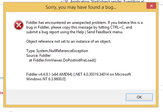 I just installed Fiddler 4 on Windows 8 and when I run it I get a NullReferenceException at Fiddler.frmViewer.DoPostInitPreLoad(). There is a screen shot attached. I've been using Fiddler for years and this is the first time I've ever had a problem like this. I Googled the error but nothing seems to match. I'm really not sure how to proceed.