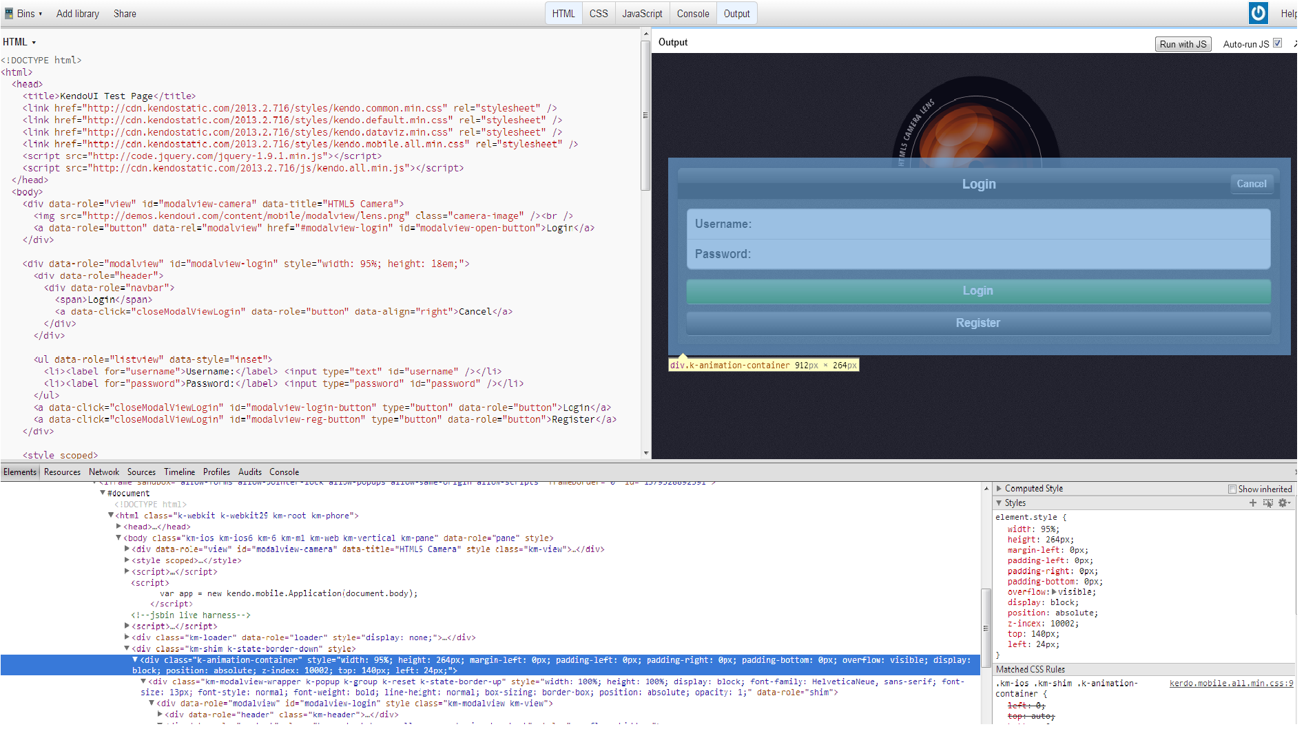 <div data-role="view" data-after-show="aftershow"> <div data-role="header"> <div data-role="navbar"> //nav stuff in here </div> </div> <p>Hi</p> <div id="window"> Content of the Window </div> <script> $("#window").kendoWindow(); </script></div>http://sdrv.ms/17vSVdW