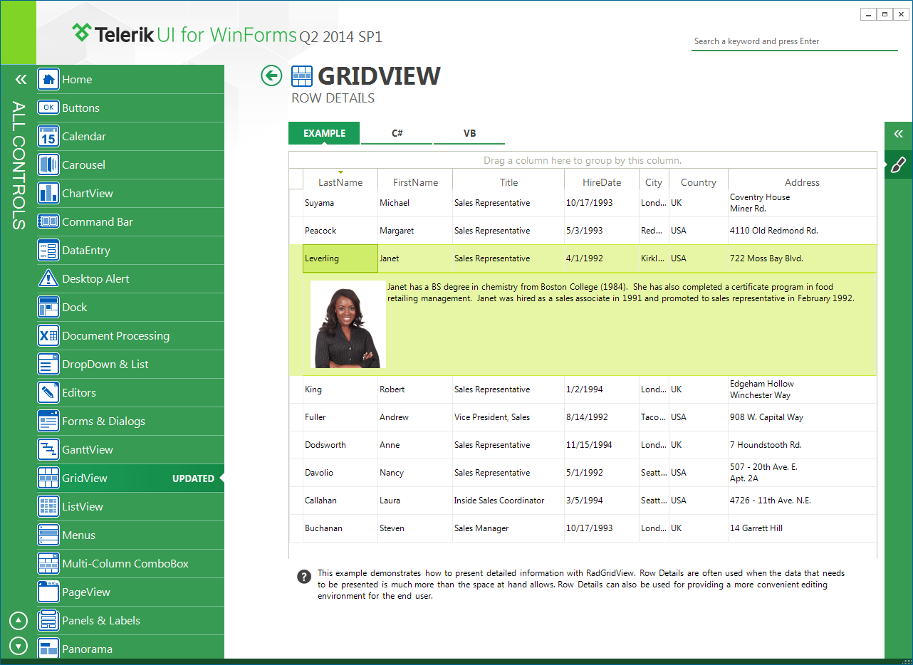 Similar functionality is available in our Demo application >> GridView >> Rows >> Row Details example. It demonstrates a sample approach how to construct a detailed row look for your grid. Feel free to modify it on a way which suits your requirement best.