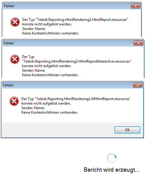 Then I added the same files and references to a bigger solution (WinForms also) and called the PreviewDialog like before in the standalone project and I generates also the reportdocument, but this time it prompt me first 3 messages with the caption Error! (Fehler!), but only once during the runtime.