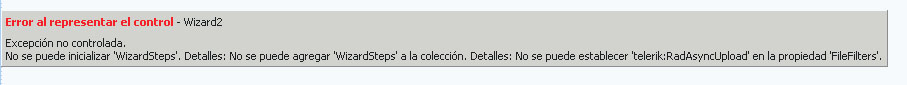 <asp:Wizard ID="Wizard2" runat="server" ActiveStepIndex="0" BackColor="#EFF3FB" BorderColor="#B5C7DE" BorderWidth="1px" Font-Names="Verdana" Font-Size="0.9em" Height="180px" Width="640px" onnextbuttonclick="Wizard1_NextButtonClick" onsidebarbuttonclick="Wizard1_SideBarButtonClick" onfinishbuttonclick="Wizard1_FinishButtonClick"> <HeaderStyle BackColor="#284E98" BorderColor="#EFF3FB" BorderStyle="Solid" BorderWidth="2px" Font-Bold="True" Font-Size="0.9em" ForeColor="White" HorizontalAlign="Center" /> <NavigationButtonStyle BackColor="White" BorderColor="#507CD1" BorderStyle="Solid" BorderWidth="1px" Font-Names="Verdana" Font-Size="0.8em" ForeColor="#284E98" /> <SideBarButtonStyle BackColor="#00AEEF" Font-Names="Verdana" ForeColor="White" /> <SideBarStyle BackColor="#00AEEF" Font-Size="0.9em" VerticalAlign="Top" Width="200px" /> <StepStyle Font-Size="0.8em" ForeColor="#333333" /> <WizardSteps> <asp:WizardStep runat="server" title="Selección Fecha"> <table align="center" class="style1"> <tr> <td class="style3"> Mes</td> <td style="text-align: center"> <telerik:RadComboBox ID="RadComboBox3" runat="server" Skin="Windows7"> <Items> <telerik:RadComboBoxItem runat="server" Owner="" Text="Enero" Value="01" /> <telerik:RadComboBoxItem runat="server" Owner="" Text="Febreo" Value="02" /> <telerik:RadComboBoxItem runat="server" Owner="" Text="Marzo" Value="03" /> <telerik:RadComboBoxItem runat="server" Owner="" Text="Abril" Value="04" /> <telerik:RadComboBoxItem runat="server" Owner="" Text="Mayo" Value="05" /> <telerik:RadComboBoxItem runat="server" Owner="" Text="Junio" Value="06" /> <telerik:RadComboBoxItem runat="server" Owner="" Text="Julio" Value="07" /> <telerik:RadComboBoxItem runat="server" Owner="" Text="Agosto" Value="08" /> <telerik:RadComboBoxItem runat="server" Owner="" Text="Septiembre" Value="09" /> <telerik:RadComboBoxItem runat="server" Owner="" Text="Octubre" Value="10" /> <telerik:RadComboBoxItem runat="server" Owner="" Text="Noviembre" Value="11" /> <telerik:RadComboBoxItem runat="server" Owner="" Text="Diciembre" Value="12" /> </Items> </telerik:RadComboBox> </td> </tr> <tr> <td class="style3"> Año</td> <td style="text-align: center"> <telerik:RadComboBox ID="RadComboBox4" runat="server" Skin="Windows7"> </telerik:RadComboBox> </td> </tr> <tr> <td class="style3"> </td> <td> </td> </tr> </table> </asp:WizardStep> <asp:WizardStep runat="server" title="Cargar Datos"> <div style="height: 32px"> <br /> <telerik:RadAsyncUpload ID="RadAsyncUploadPrueba0" runat="server" AllowedFileExtensions="xls,xlsx" MaxFileInputsCount="1" MaxFileSize="524288" OnClientFileSelected="" OnClientFilesSelected="" OnClientValidationFailed="validationFailed" OnFileUploaded="RadAsyncUpload1_FileUploaded"> <filefilters> <telerik:FileFilter Description="*.xls; *.xlsx" Extensions="xls,xlsx" /> </filefilters> </telerik:RadAsyncUpload> <br /> </div> </asp:WizardStep> </WizardSteps> </asp:Wizard>the error is in the filter property RadAsyncUpload, can not be established.