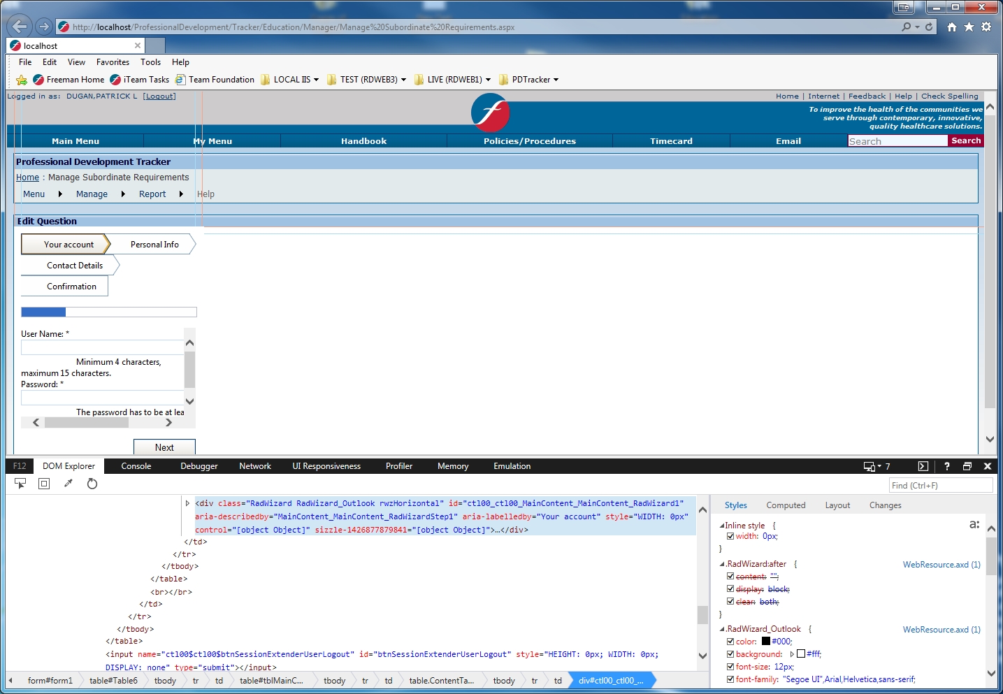 When I highlight the RadWizard control in the DOM explorer, you can see the width shows "0px" (right hand column under "InLine style")