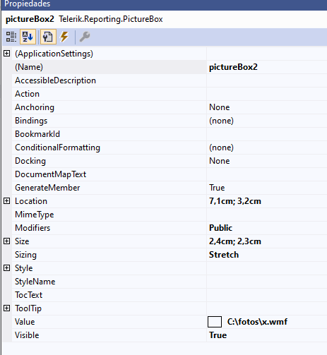 Hi, I have a reporting with a picturebox. In the properties box set the value to C:\fotos\imge1.wmf and can see the wmf in the picturebox. But when print the report picturebox is empty. I have tried to change values of sizing property to (Stretch,ScaleProportional,AutoSize,Center,Normal) and resize the picturebox in multiples sizes without results. I use Telerik Reporting R3 2020 which is compatible with wmf files.
