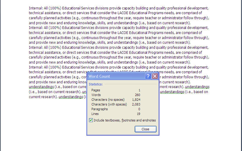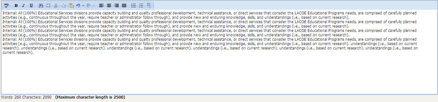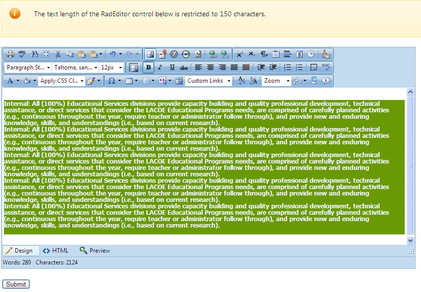 var editorList = new Object();var editorLengthArray = [20, 30];var counter = 0;AlreadyAlerted = false;function isAlphaNumericKey(keyCode) { if ((keyCode > 47 && keyCode < 58) || (keyCode > 64 && keyCode < 91)) { return true; } return false;}function LimitCharacters(editor) { var style = editor.get_contentArea().style; style.backgroundImage = "none"; style.backgroundColor = "white"; editorList[editor.get_id()] = editorLengthArray[counter]; counter++; editor.attachEventHandler("onkeydown", function(e) { var content = editor.get_text().trim(); //returns the editor's content as plain text var words = 0; if (content) { var punctRegX = /[!\.?;,:&_\-\-\{\}\[\]\(\)~#'"]/g; var contentcontent = content.replace(punctRegX, ""); var trimRegX = /(^\s+)|(\s+$)/g; contentcontent = content.replace(trimRegX, ""); if (content) { splitRegX = /\s+/; var array = content.split(splitRegX); words = array.length; } } var counter = $get("counter"); counter.innerHTML = "Words: " + words + " Characters: " + content.length + " <b>(Maximum character length is 2500)</b>"; e = (e == null) ? window.event : e; if (isAlphaNumericKey(e.keyCode)) { var maxTextLength = 2500; textLength = editor.get_text().length; if (textLength >= maxTextLength) { alert('You have exceeded the maximun character count of 2500.'); //alert('1'); AlreadyAlerted = true; e.returnValue = false; } } });} function CalculateLength(editor, value) { var textLength = editor.get_text().length; var clipboardLength = value.length; textLength += clipboardLength; return textLength;}function ClientExecuteCommand(editor, args) { var commandName = args.get_commandName(); var value = args.get_value(); if (commandName == "PastePlainText" || commandName == "Paste") { var textLength = CalculateLength(editor, value); if (textLength >= 2500) { if (!AlreadyAlerted) { alert("You have exceeded the maximun character count of 2500."); } AlreadyAlerted = false; args.set_cancel(true); } }}<telerik:RadEditor ID="RadEditor1" runat="server" SkinID="" Width="100%" SpellCheckSettings-AllowAddCustom="false" ToolsFile="../TelerikRichEditControl/ToolsFile.xml" OnClientPasteHtml="ClientExecuteCommand" Skin="Office2007" Height="300" EditModes="Design" OnClientLoad="LimitCharacters"></telerik:RadEditor><span id="counter">Really appreciate your help.