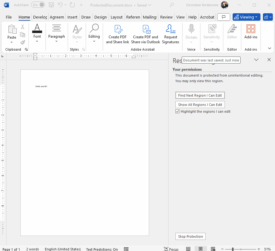editor.Protect("TestPassword");I am generating a RadFlowDocument, and at the end protecting the entire document with a custom password like below..