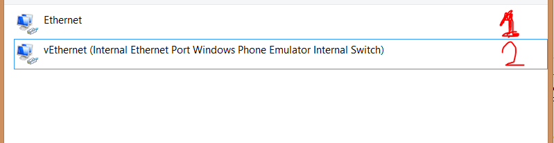 2) I've attached the snapshot of my network adapters, that exist before I run the emulator with the help of AppBuilder. 1st adapter is my usual internet connection and the second is the adapter used by emulator. When I open settings for both of this connections, I see, that Hyper-V checkbox is disabled for them and Ipv6 and Ipv4 checkboxes enabled.