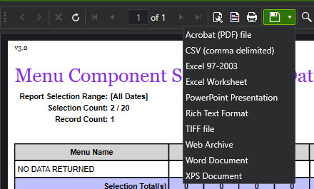 In WPF there is an export icon looks like a diskette. One can specify what type of export. PDF, Exel etc. then a call to Windows "Save As" dialog box.