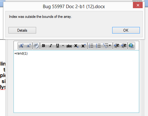 I've written a xaml for adding annotation through a RadRichTextBox on contents in a Word document. But when I try to insert sample text using =rand() im getting the error attached.