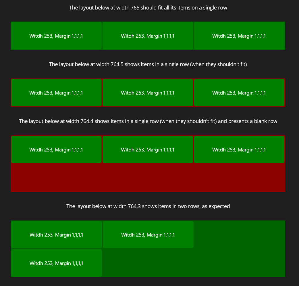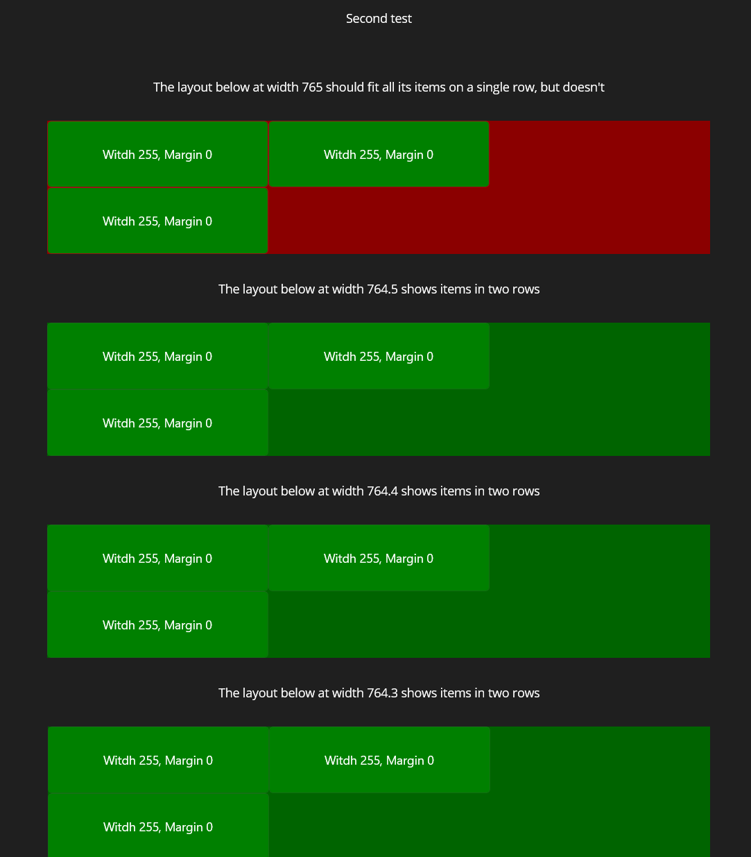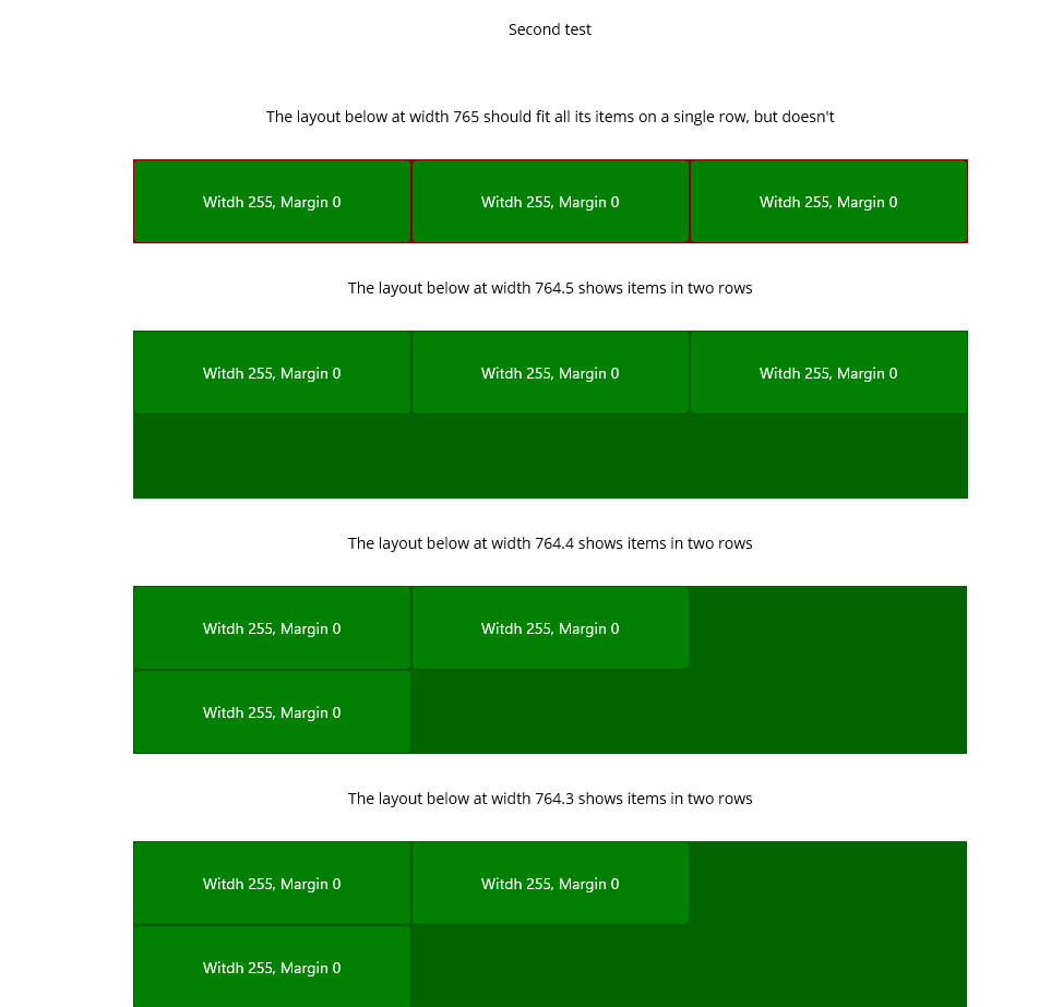 - Test 1.3 fails - items are shown on a single row when they should not fit, and the wrap layout is extended to two rows.