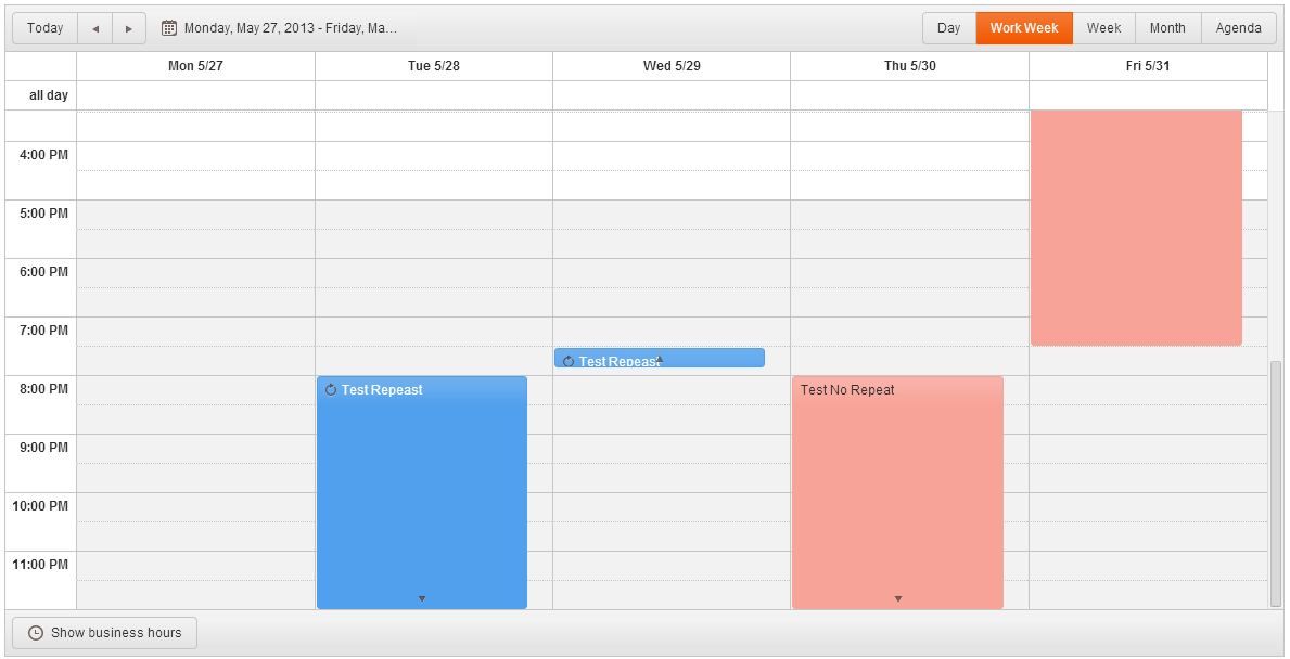 Attached is an image that contains 2 events. Both events run from 8PM to 7:30PM the next day. The blue event has a weekly repeat set such that it repeats every tuesday. The other event does not have this set. These events were created on the Dojo.