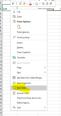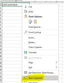 How can I write comments to a cell? Like if I were Excel and went to do it, I would right-click the cell I want to write a comment to and click "New Comment":