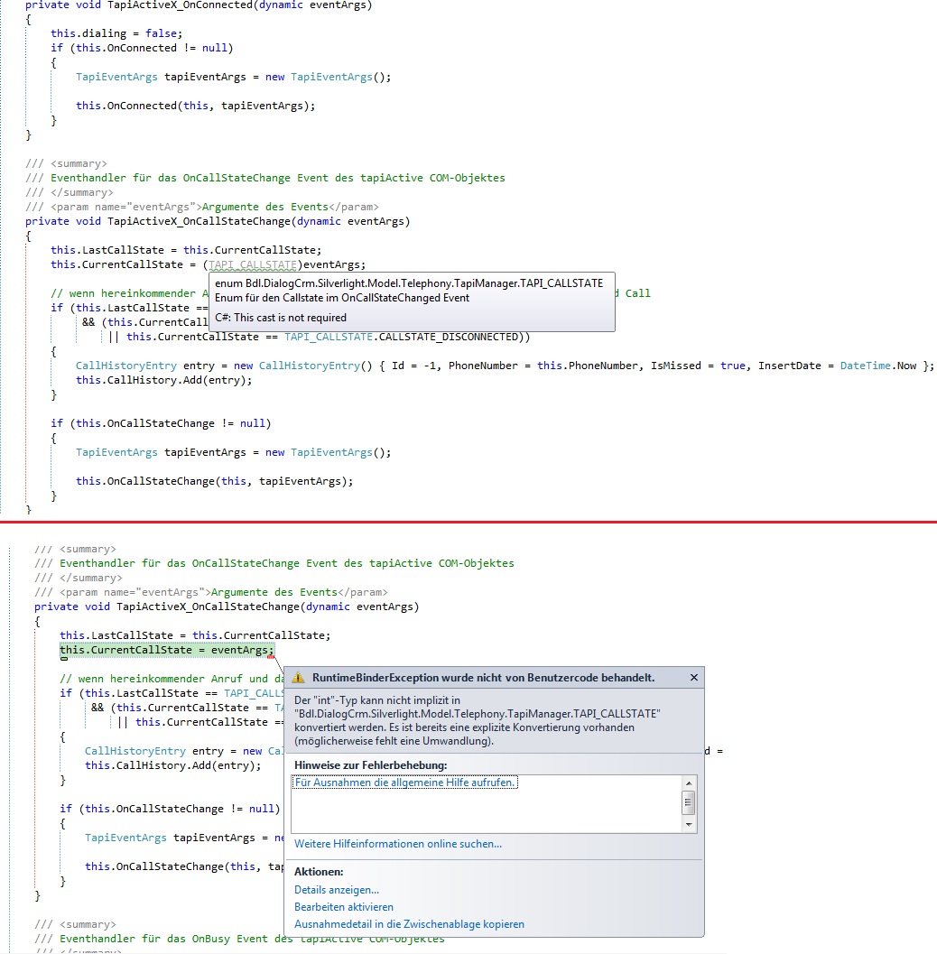 private void TapiActiveX_OnCallStateChange(dynamic eventArgs) { this.LastCallState = this.CurrentCallState; this.CurrentCallState = (TAPI_CALLSTATE)eventArgs; // wenn hereinkommender Anruf und dann weg (IDLE oder diconnected), dann ist es ein Missed Call if (this.LastCallState == TAPI_CALLSTATE.CALLSTATE_OFFERING && (this.CurrentCallState == TAPI_CALLSTATE.CALLSTATE_IDLE || this.CurrentCallState == TAPI_CALLSTATE.CALLSTATE_DISCONNECTED)) { CallHistoryEntry entry = new CallHistoryEntry() { Id = -1, PhoneNumber = this.PhoneNumber, IsMissed = true, InsertDate = DateTime.Now }; this.CallHistory.Add(entry); } if (this.OnCallStateChange != null) { TapiEventArgs tapiEventArgs = new TapiEventArgs(); this.OnCallStateChange(this, tapiEventArgs); } }